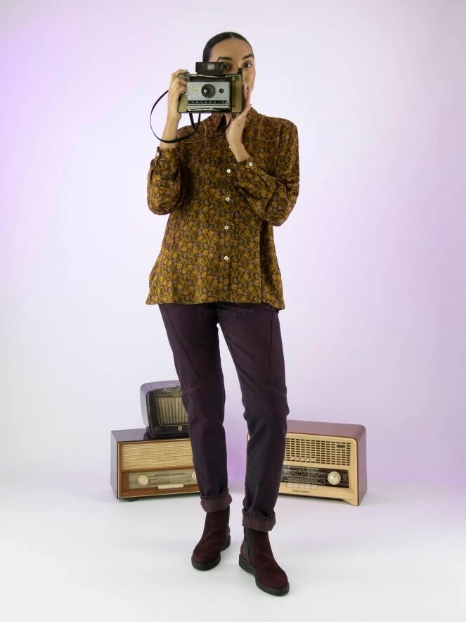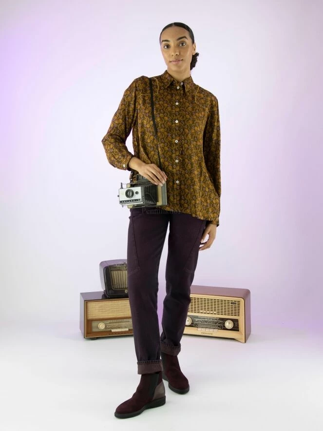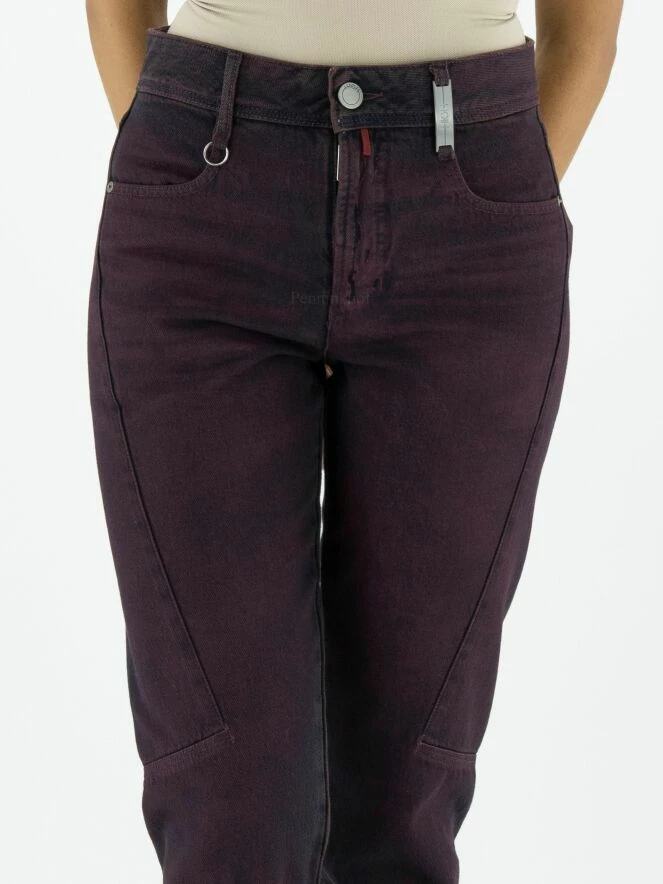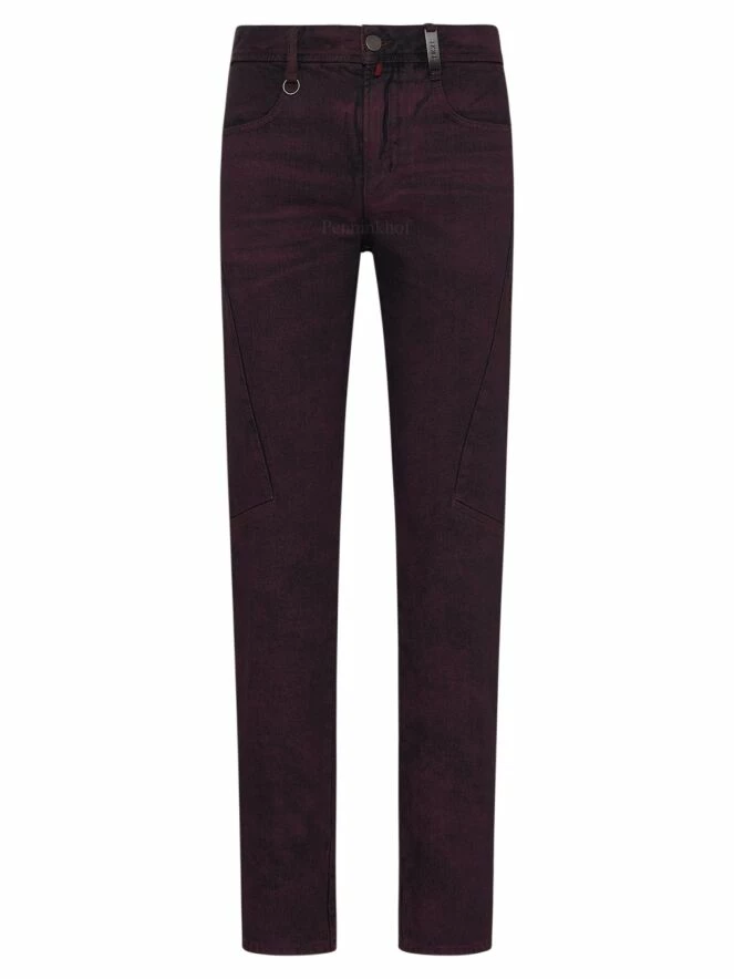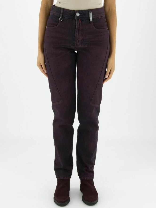 Jeans de High dans une couleur bordeaux mélangée avec un denim foncé comme base. Sur le côté de la taille se trouve une couture centrale au niveau du genou. Ce jeans peut être lavé à la main.