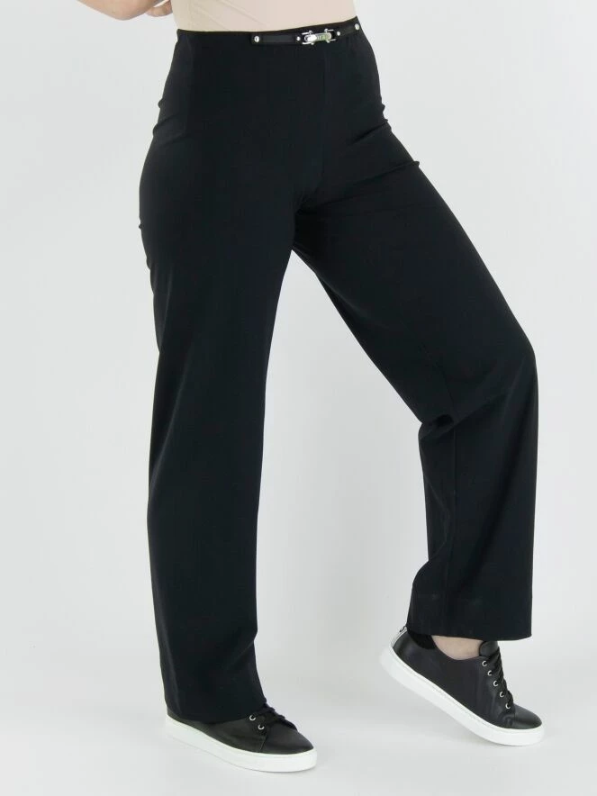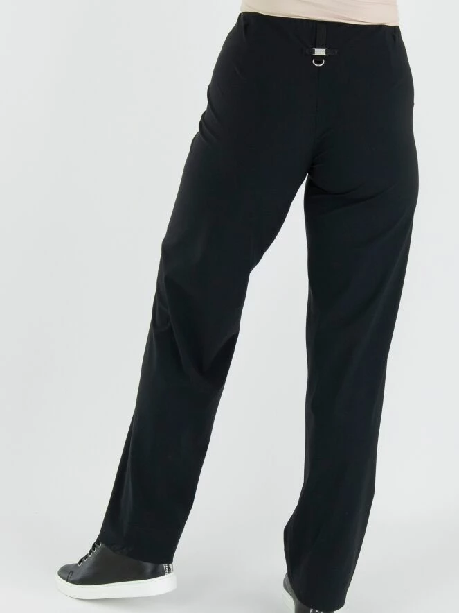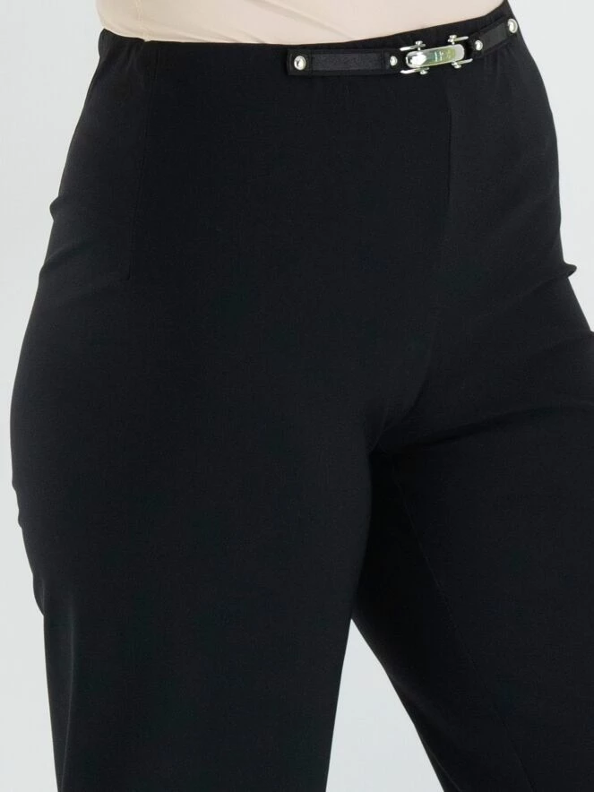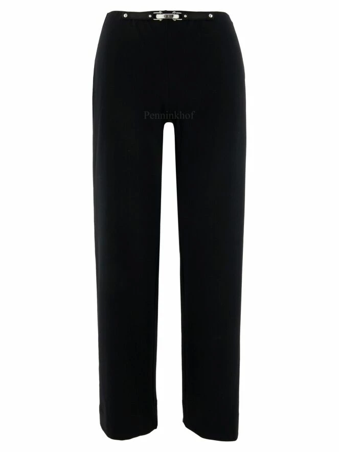 Un pantalon de High en noir. Il y a une bande élastique à la taille. Sur le devant, à la hauteur de la taille, il y a une boucle décorative de couleur nickel avec 2 clous. Ce pantalon peut être lavé à 30 degrés.