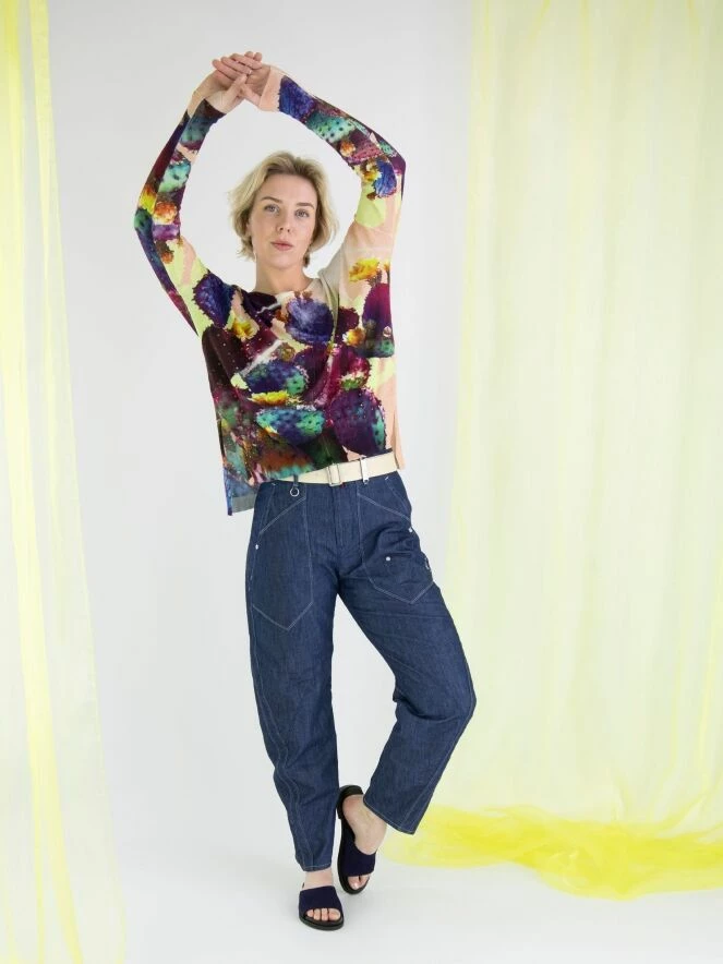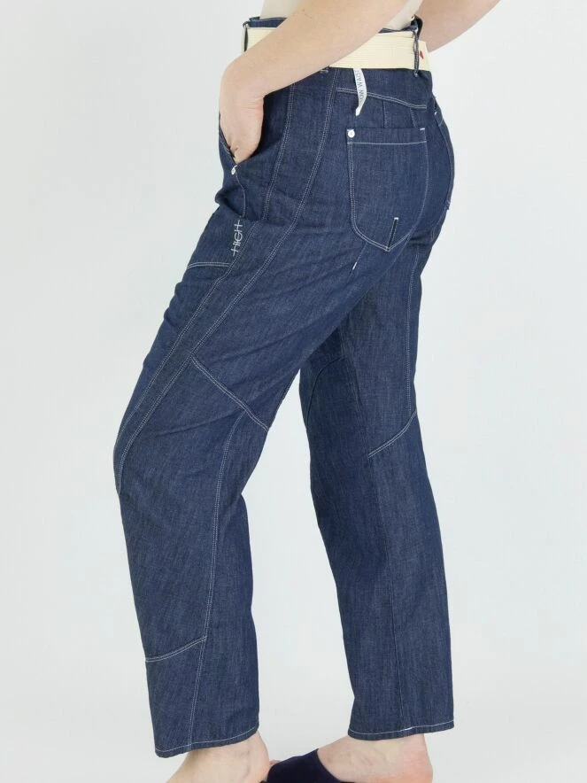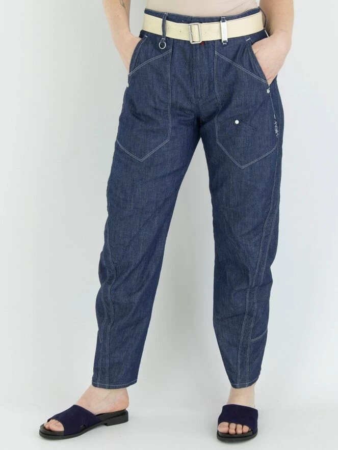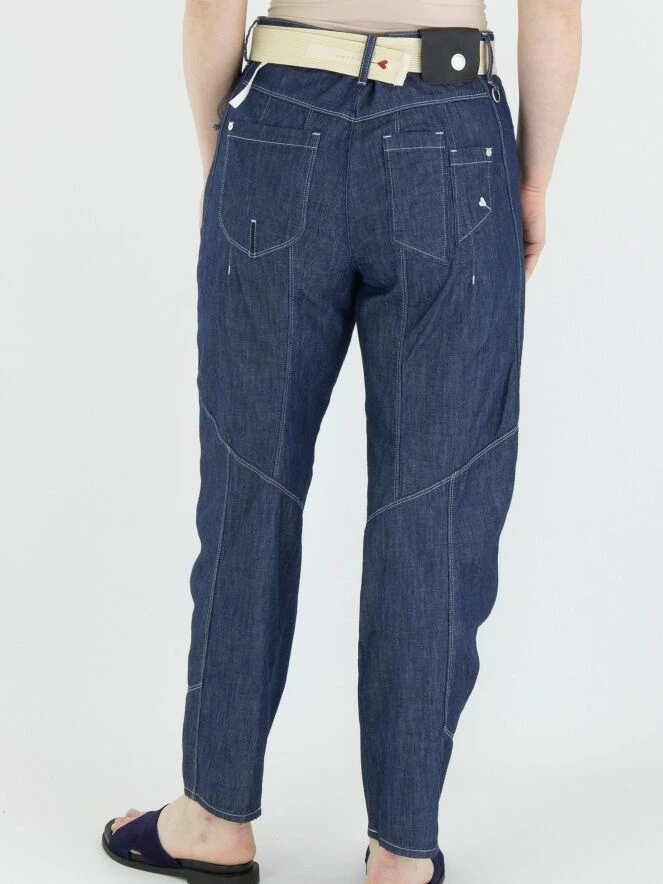 Un jean de High dans une couleur de denim basique de qualité jeans d’été souple. À la taille, il y a une ceinture en jute beige. Le pantalon a des poches latérales profondes, qui, comme toutes les coutures, sont accentuées avec du fil blanc. Ce jean peut être lavé à 30 degrés.