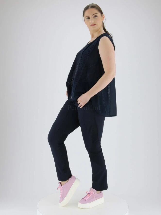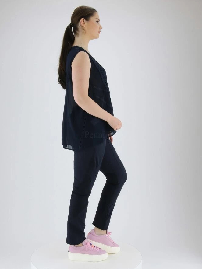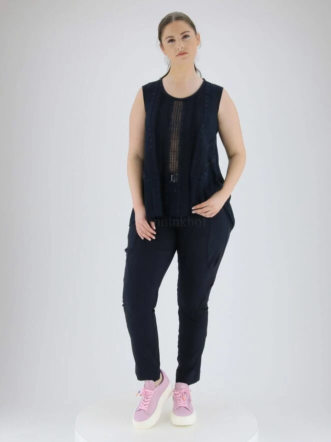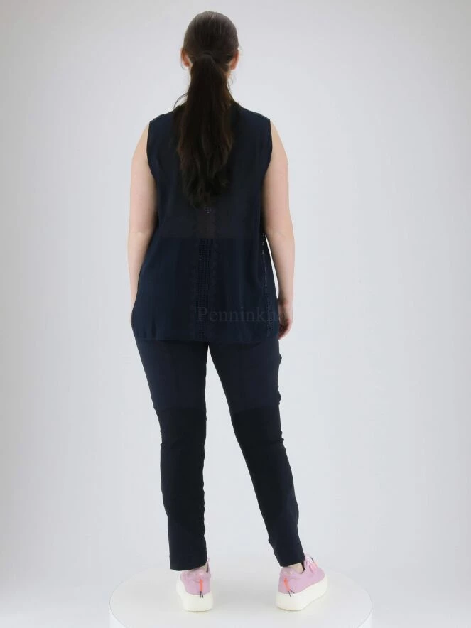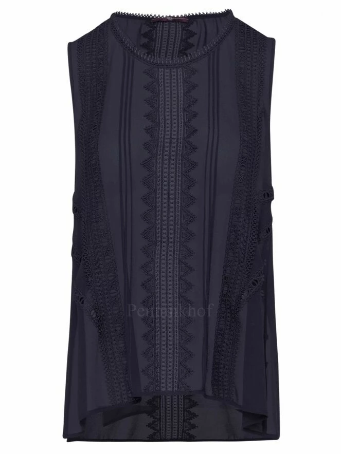 Top sans manches lĂ©gèrement transparent de la marque High, de couleur bleu marine. De multiples bandes de dentelle avec nĹ“ud et nervures traversent l’avant du col Ă l’ourlet. Au dos, une large garniture en dentelle descend en son centre. Le col rond est bordĂ© de dentelle ajourĂ©e Ă nĹ“uds. Lavage Ă la main.