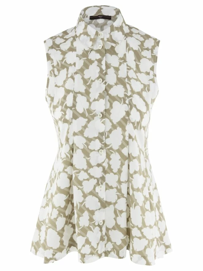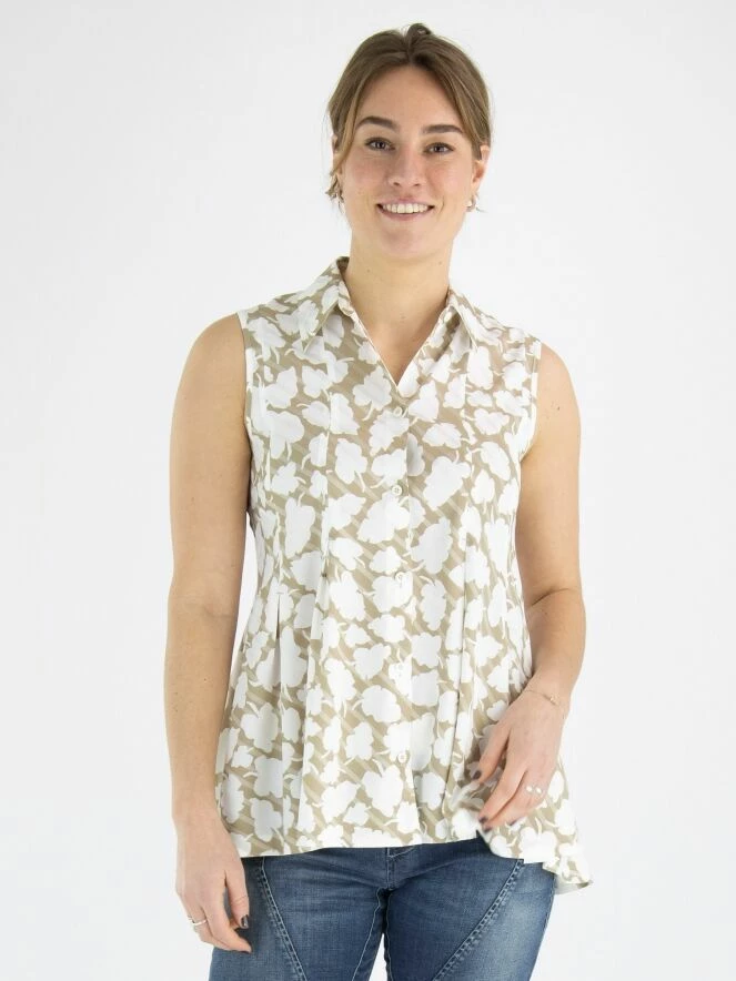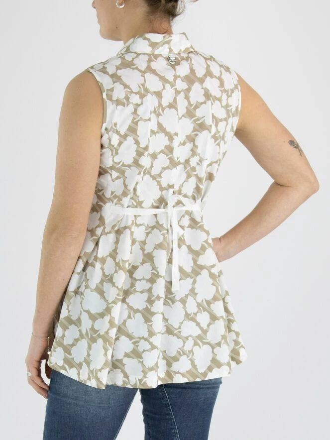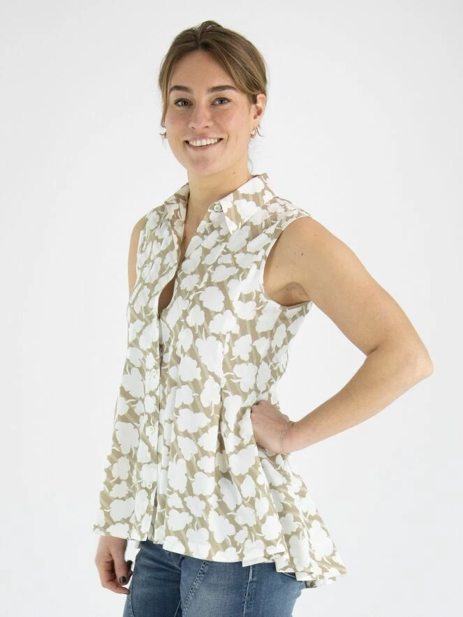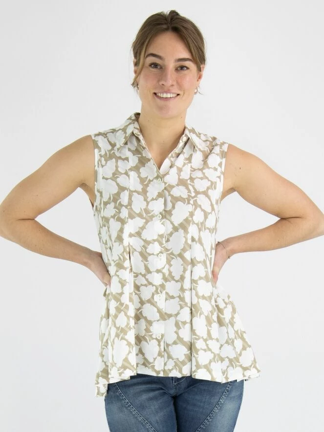 Un top ou hes de High dans un imprimé de feuilles avec les couleurs blanc et sable. À partir de la taille, plusieurs plis donnent un effet de largeur. Dans le bas, il y a de profondes fentes des deux côtés. Ce top doit être lavé à la main.
