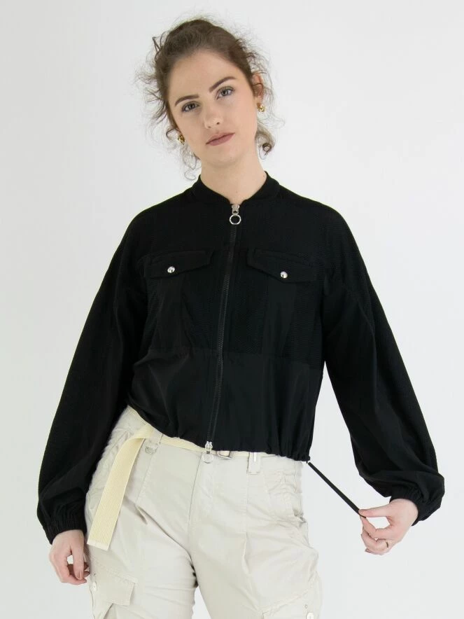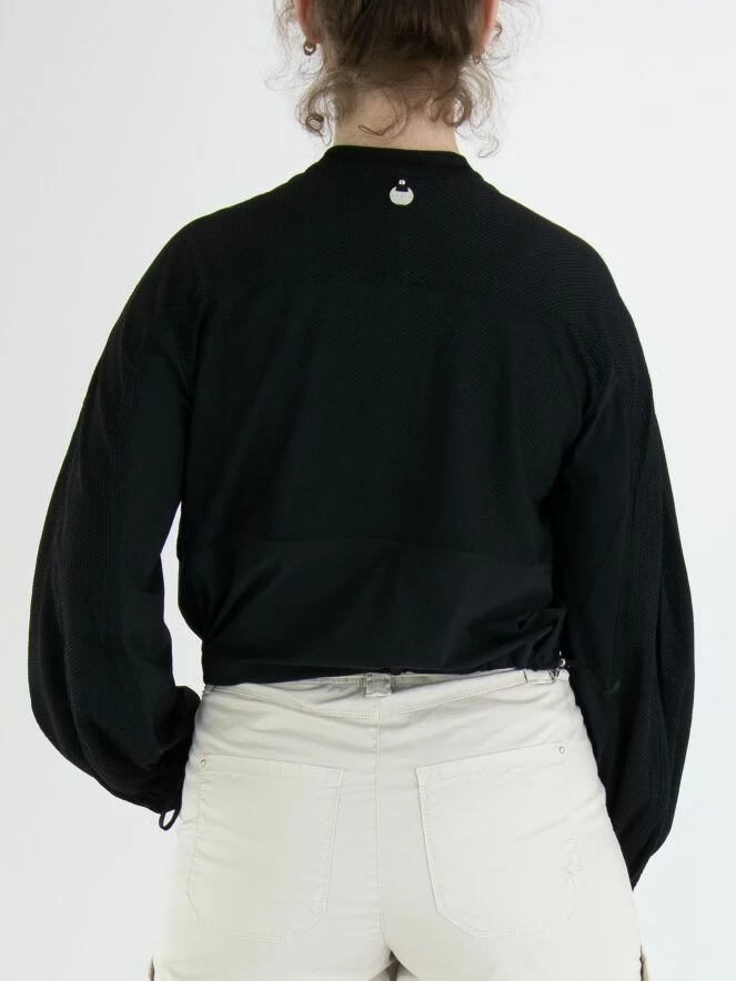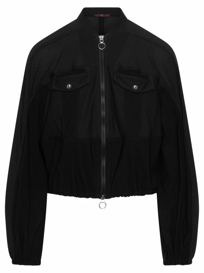 Gilet noir de High dans un tissu Ă©lastique lĂ©gèrement transparent tissĂ© en structure de filet. Sous la poitrine et le bas des manches se trouve un tissu uni. Les poches poitrine ont une fermeture Ă pression dĂ©corative, et le gilet lui-mĂŞme a une fermeture Ă glissière. Ă€ l’extrĂ©mitĂ© des manches, il y a une garniture Ă©lastique finement plissĂ©e. Ce gilet peut ĂŞtre lavĂ© Ă la main.