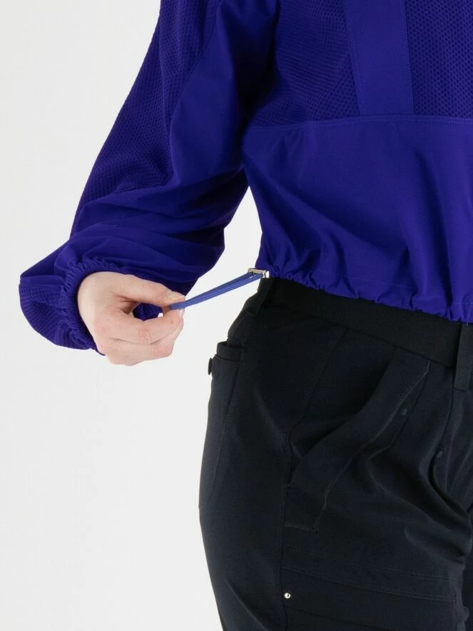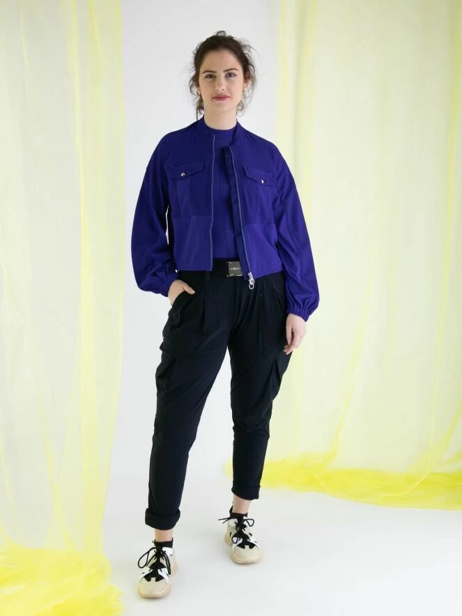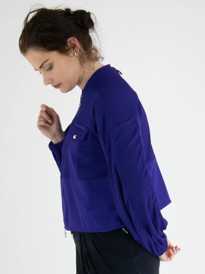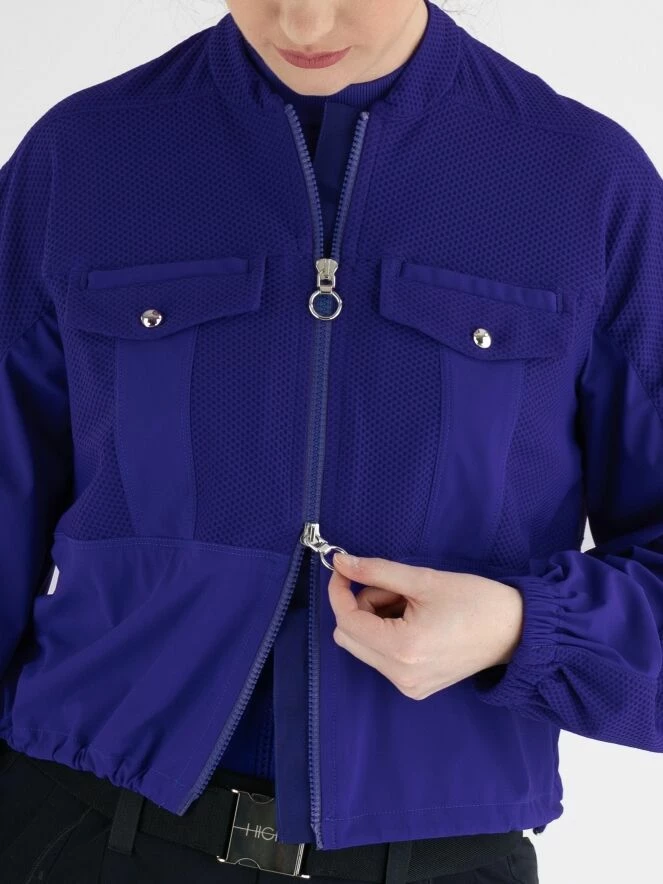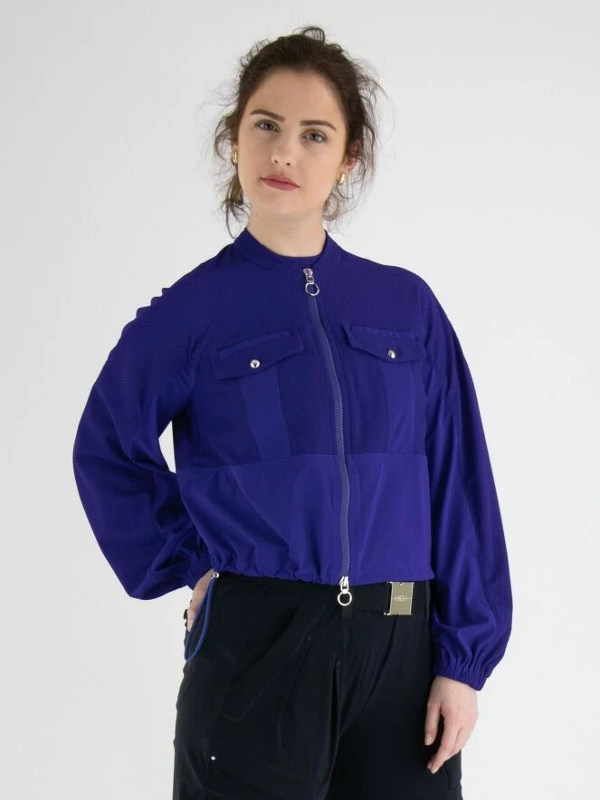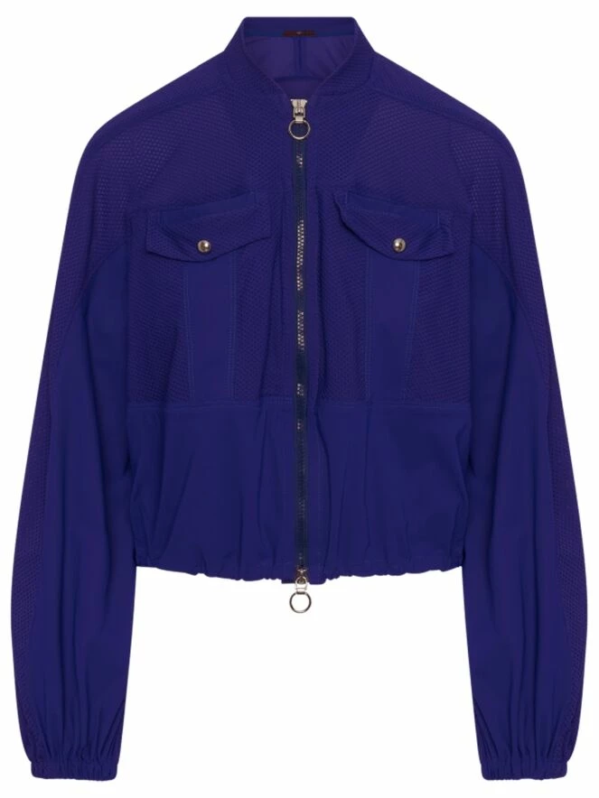 n cardigan de High en bleu cobalt, en tissu élastique légèrement transparent tissé dans une structure de filet. Sous la poitrine et la partie inférieure des manches sont en tissu uni. Les poches poitrine comportent des fermetures à bouton-pression décoratives, et le cardigan lui-même a une fermeture éclair. À l’extrémité des manches, il y a une bordure élastique finement plissée. Ce cardigan doit être lavé à la main.