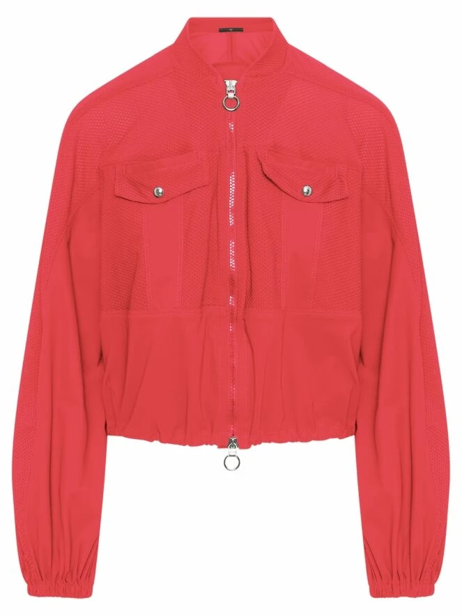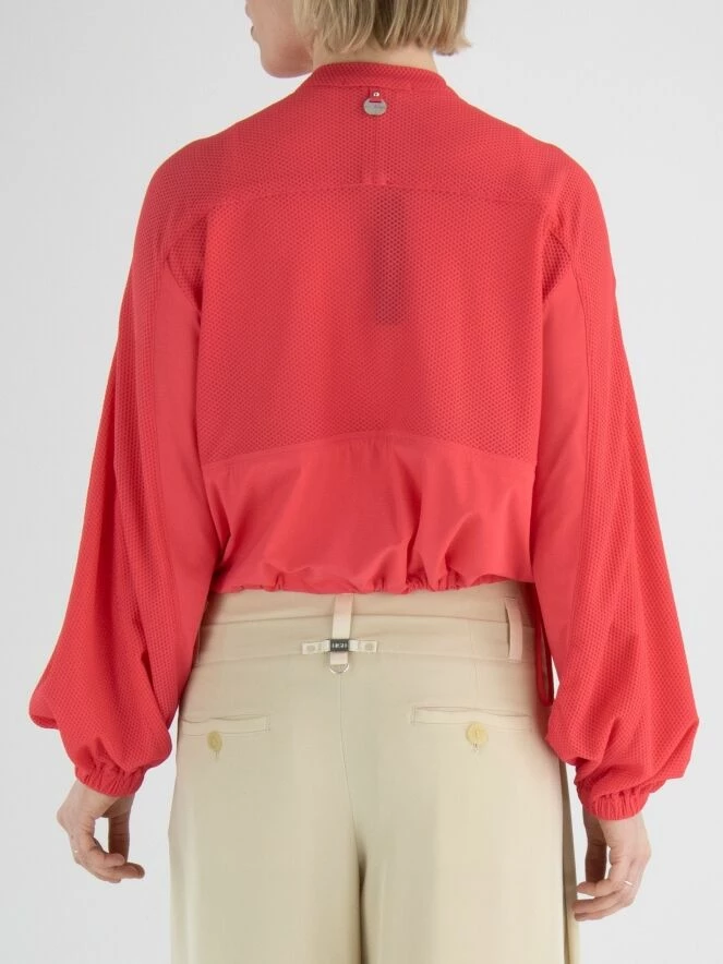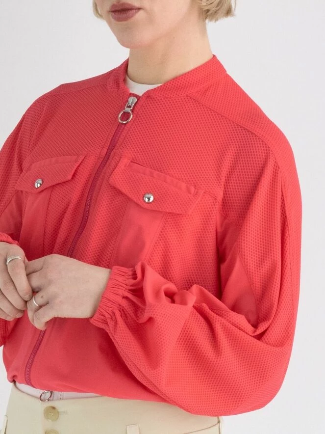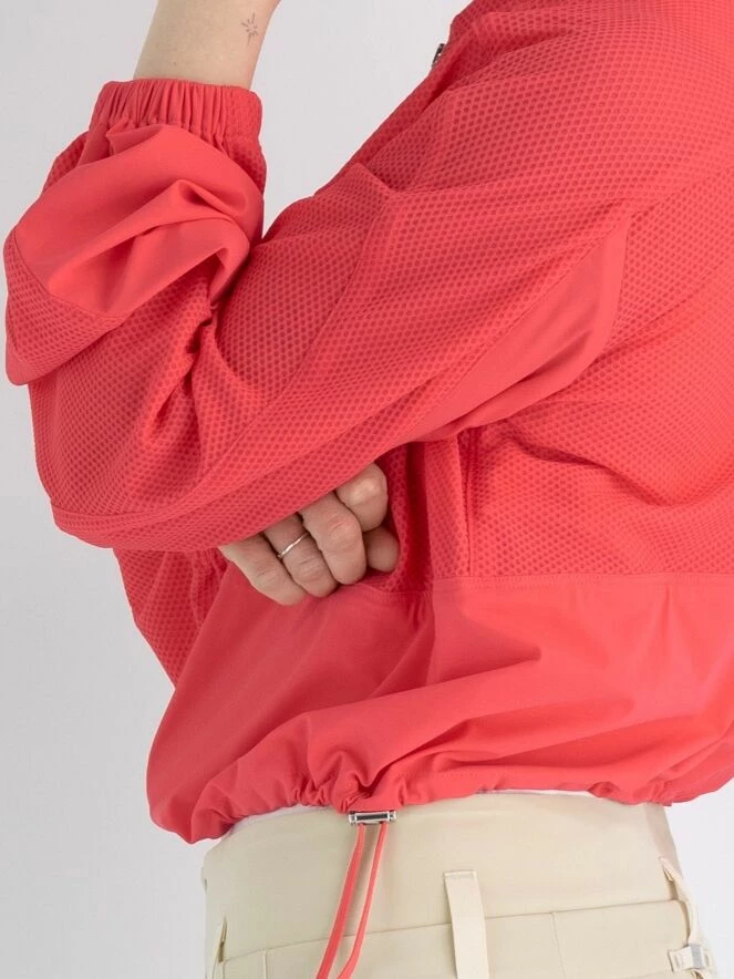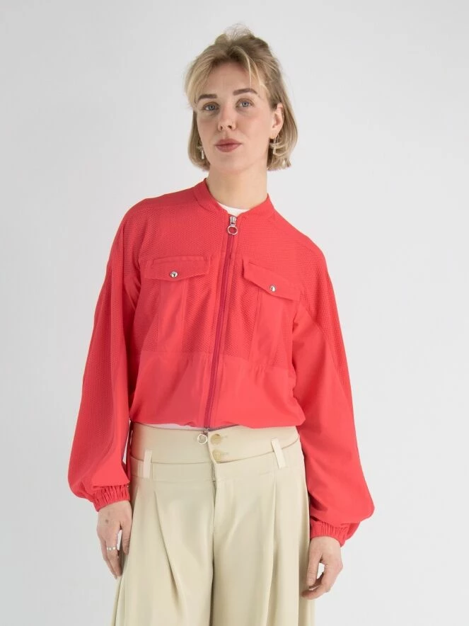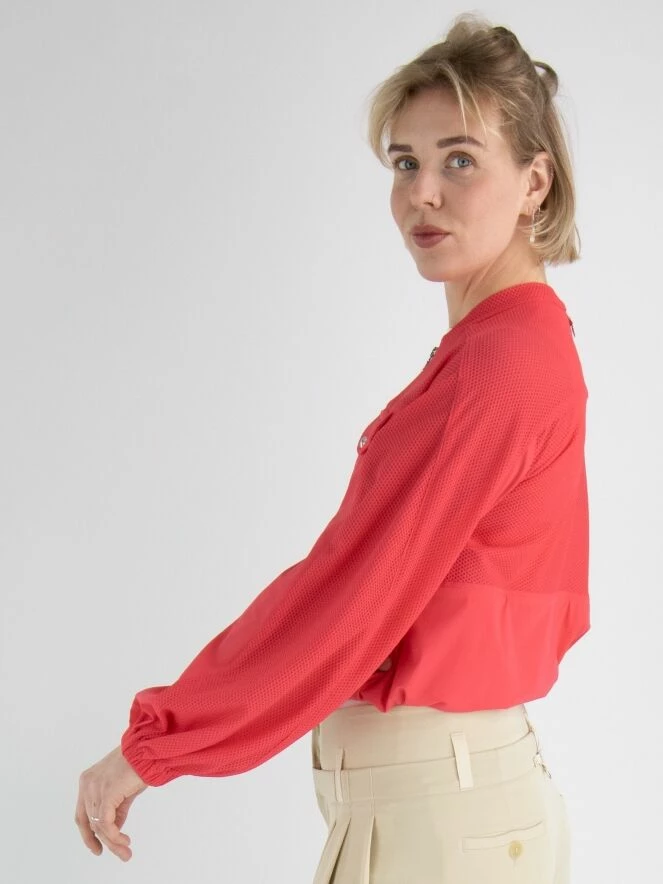 Un gilet corail de High dans un tissu élastique légèrement transparent tissé dans une structure en filet. Sous la poitrine et en bas des manches se trouve un tissu de couleur unie. Les poches de poitrine ont une fermeture à bouton-pression décorative, et le gilet lui-même a une fermeture à glissière. À l’extrémité des manches se trouve une garniture élastique finement plissée. Ce gilet peut être lavé à la main.
