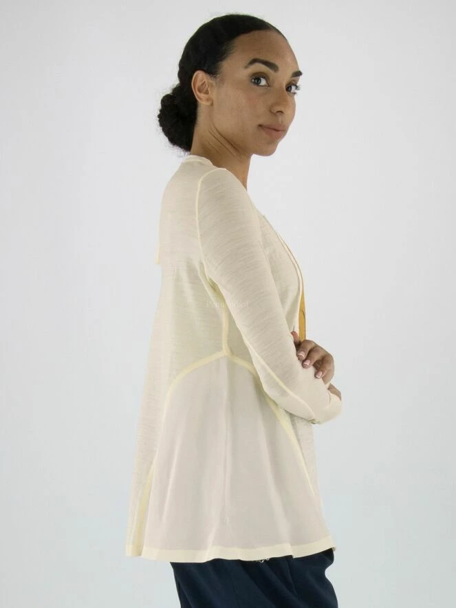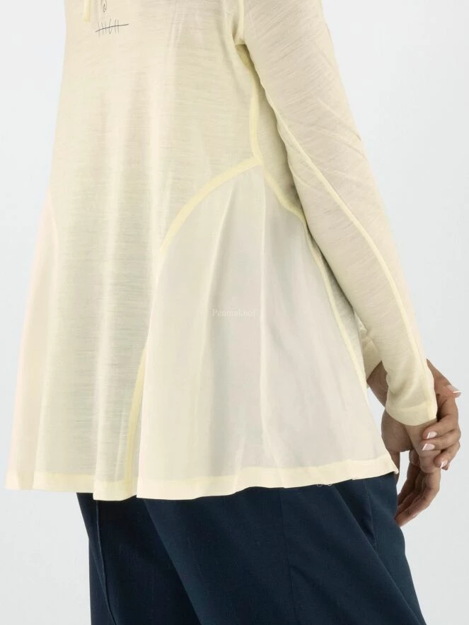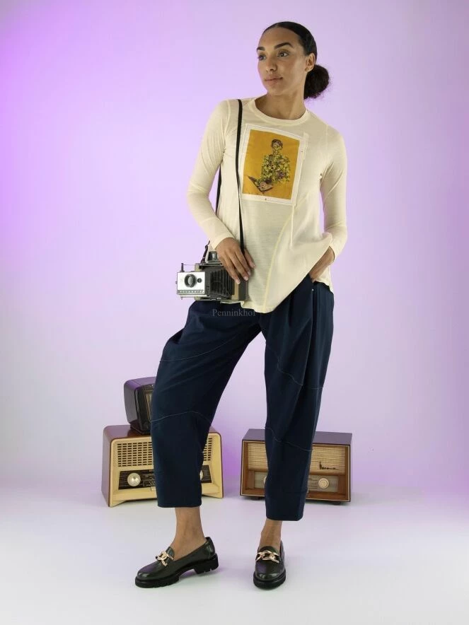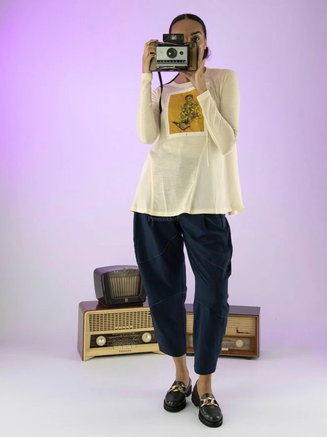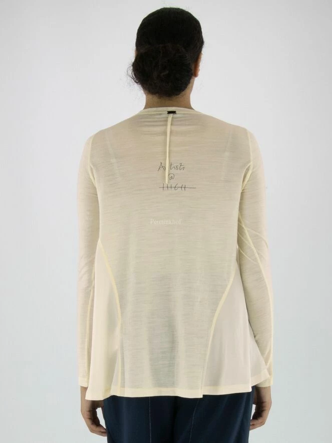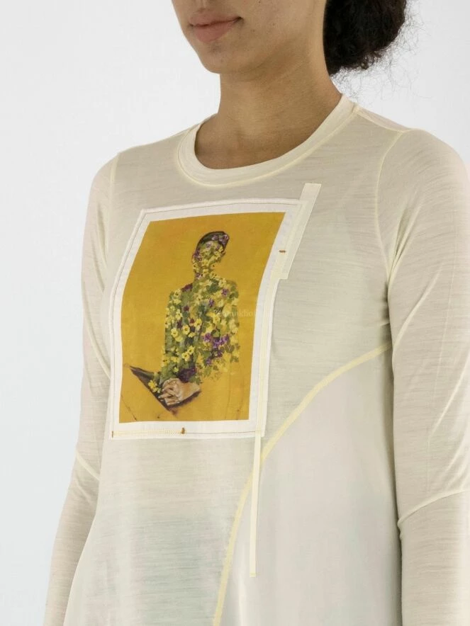 Une T shirt de High en blanc crème. Sur le devant figure une photo du photographe Enrico de Luigi. La chemise a une ligne A et, à partir de l’aisselle, les côtés sont en tissu satiné mat. Cette T – shirt peut être lavée à la main.