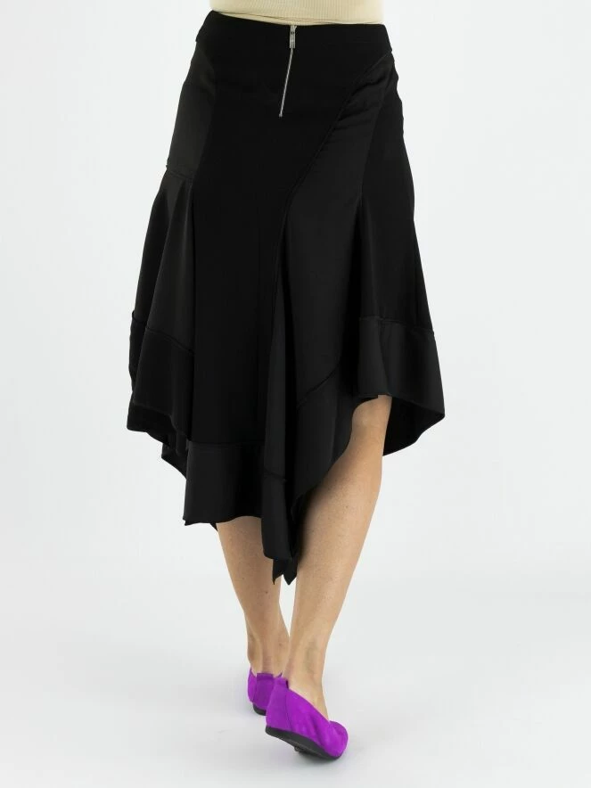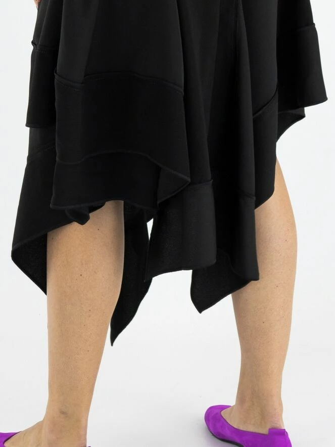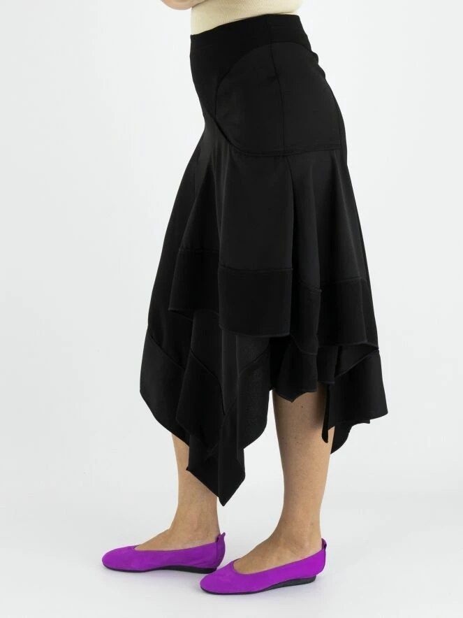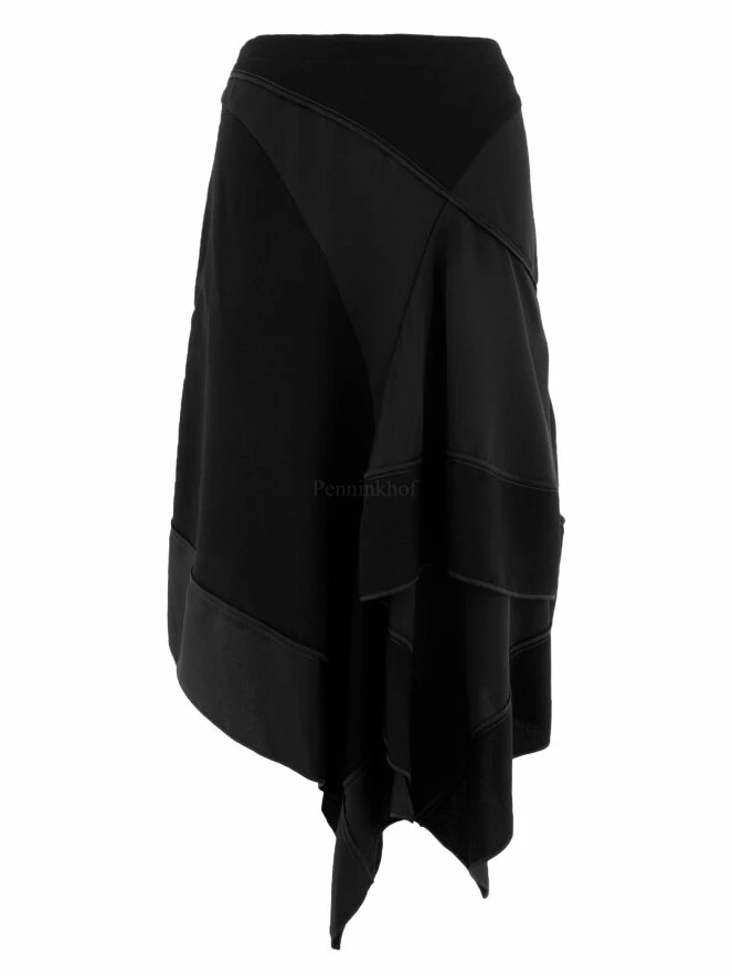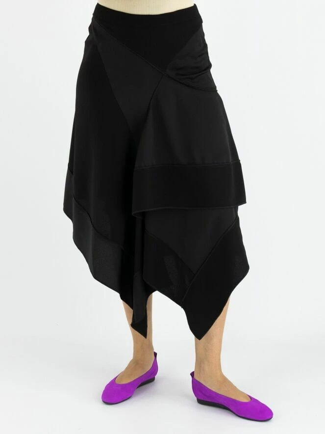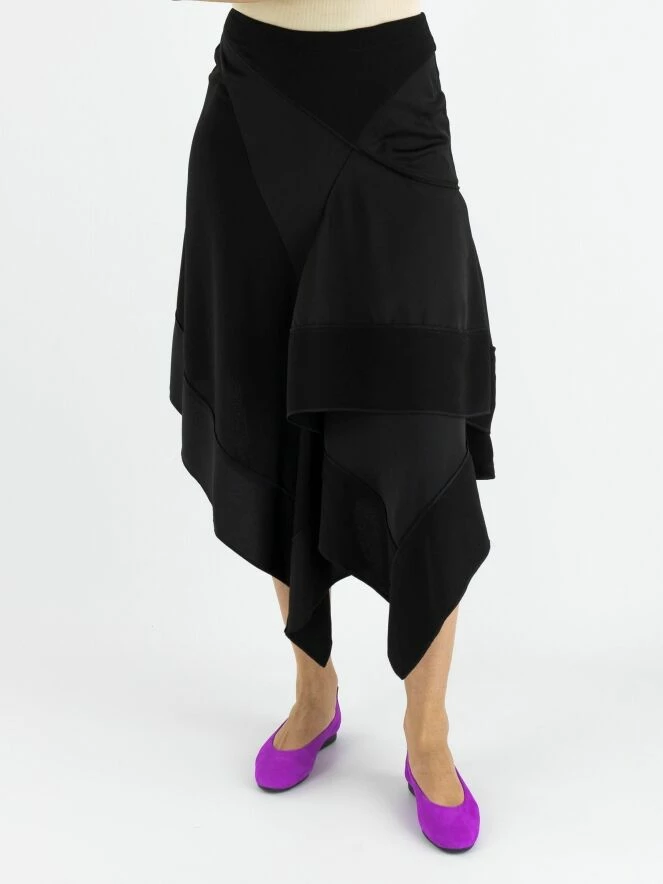 Une jupe de High dans plusieurs nuances de noir. Les tissus de la jupe sont mats, satin mat et semi-transparent mat en bas. La jupe a une forme en A, et à partir de la taille, il y a plusieurs coutures diagonales courbées et plis. Cette jupe peut être lavée à la main.