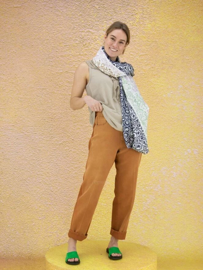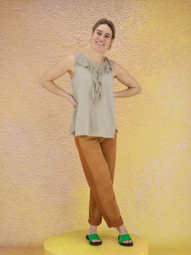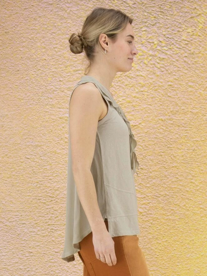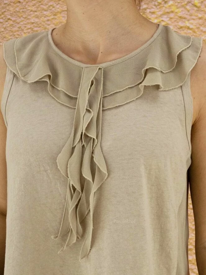 Top sans manches de la marque High, de couleur sable. Ce top présente une ligne A avec un dos plus long de 15 cm. Un double volant légèrement transparent orne le col avec 2 rubans ondoyants au centre. Le dos et les côtés sont en tissu légèrement transparent. Lavage à la main.