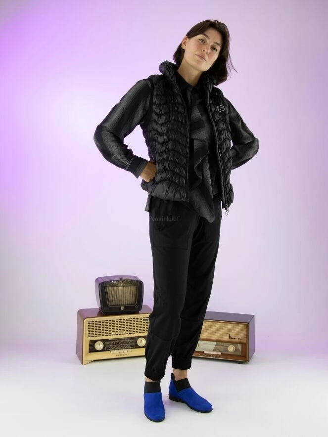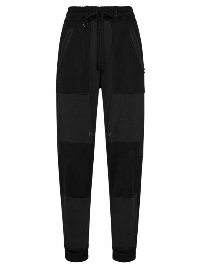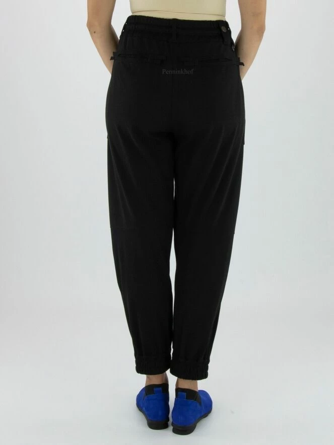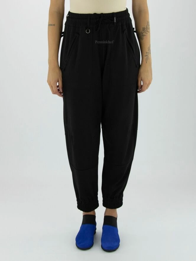 Pantalon de jogging de luxe de couleur noire. La taille est dotée d’une large bande élastique finement côtelée. Les poches latérales et les genoux ont un aspect mat, et le bord des poches latérales est bordé d’une bande de jute. Au bas des jambes, il y a une bande élastique finement côtelée. Ce pantalon peut être lavé à la main.