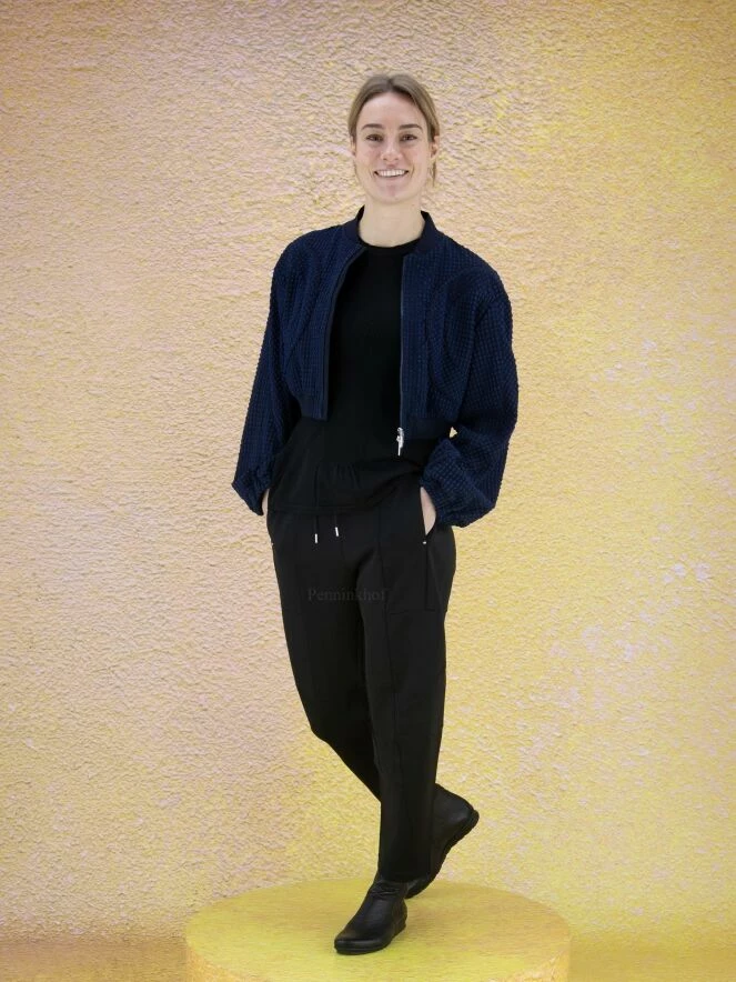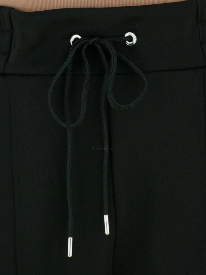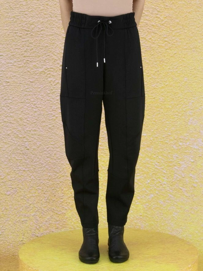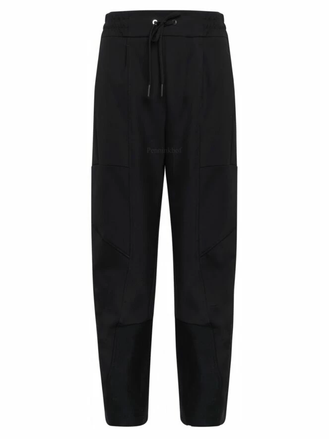 Pantalon de jogging de la marque High, de couleur noire. La taille est Ă©quipĂ©e d’une bande Ă©lastique finement froncĂ©e avec un cordon de serrage sous tunnel. Le pantalon prĂ©sente des coutures horizontales et diagonales. Un clou dĂ©coratif orne l’entrĂ©e des poches latĂ©rales. Lavage Ă la main.