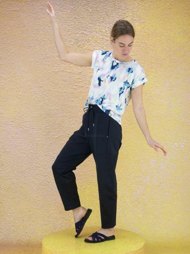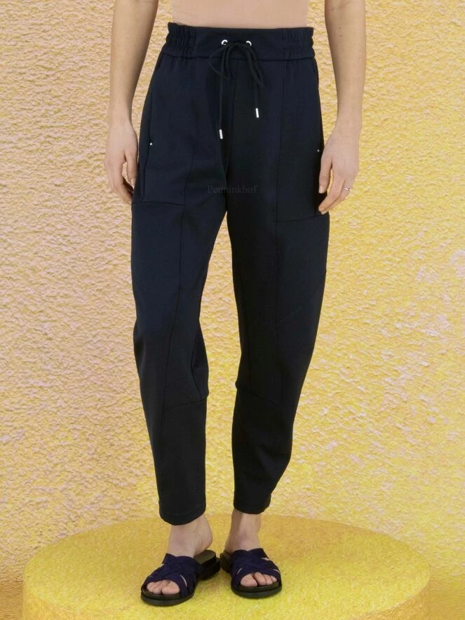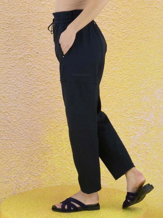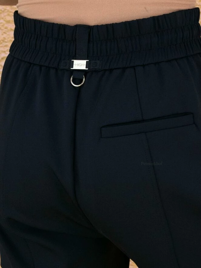 Pantalon de jogging de la marque High, de couleur bleu marine. La taille est équipée d’une bande élastique finement froncée avec un cordon de serrage sous tunnel. Le pantalon présente des coutures horizontales et diagonales. Un clou décoratif orne l’entrée des poches latérales. Lavage à la main.
