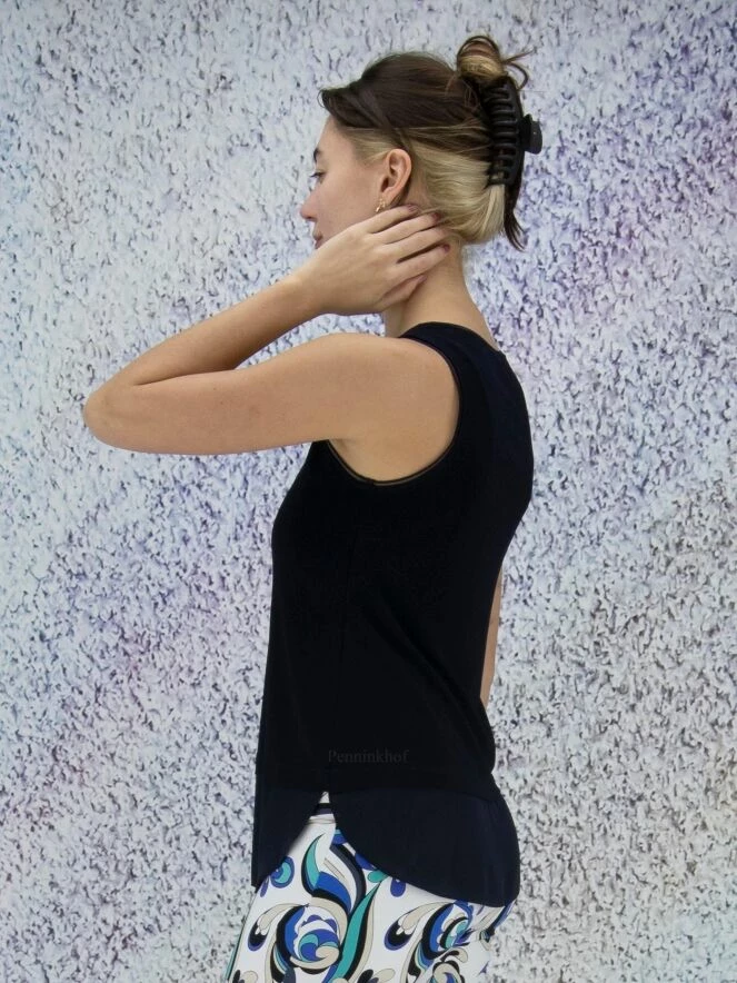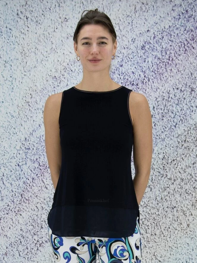 Top long sans manches, de la marque Joseph Ribkoff, de couleur bleu marine. Le bas est fait d’une large bande de tissu noir transparent légèrement virevoltant. Le col rond et les larges emmanchures sont ornés de passepoils en voile transparent. Lavage à la main.