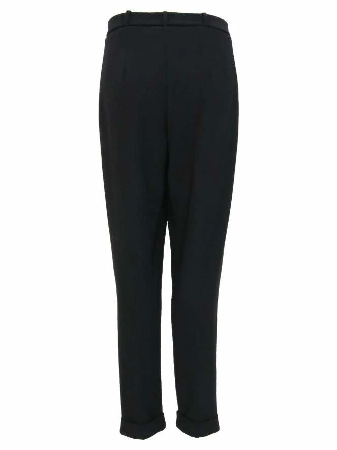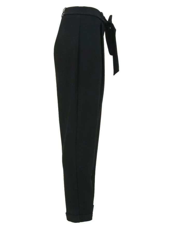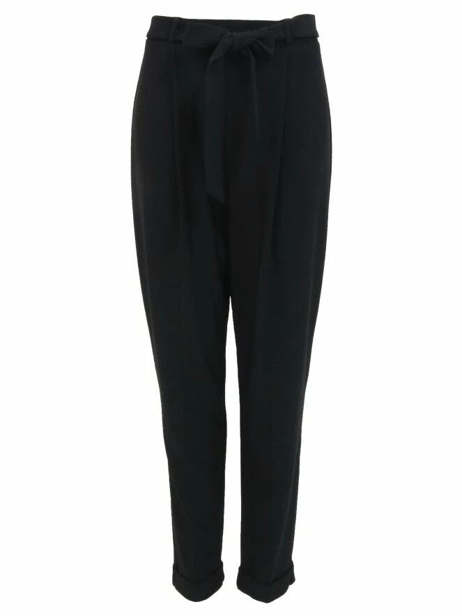 Pantalon de couleur noire de la marque Joseph Ribkoff. Le pantalon est orné d’une ceinture à nouer dans le même tissu que le pantalon. Le bas des jambes est équipé de revers. Lavage à la main.