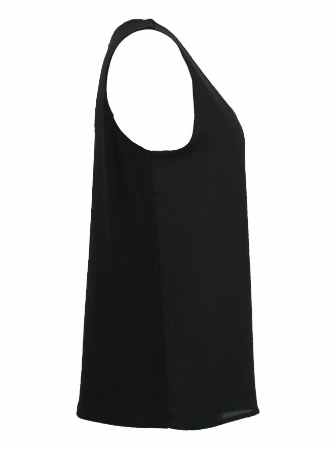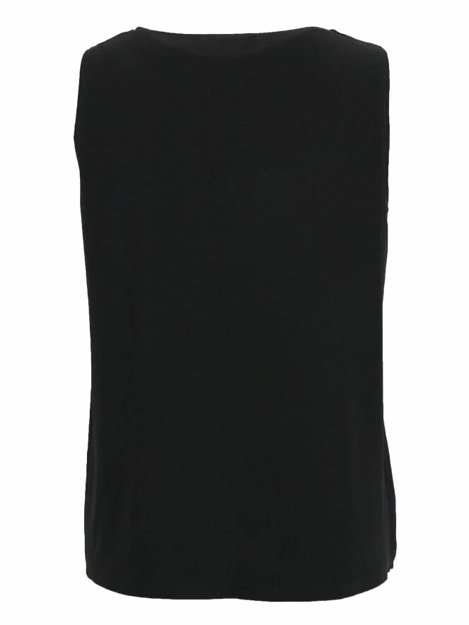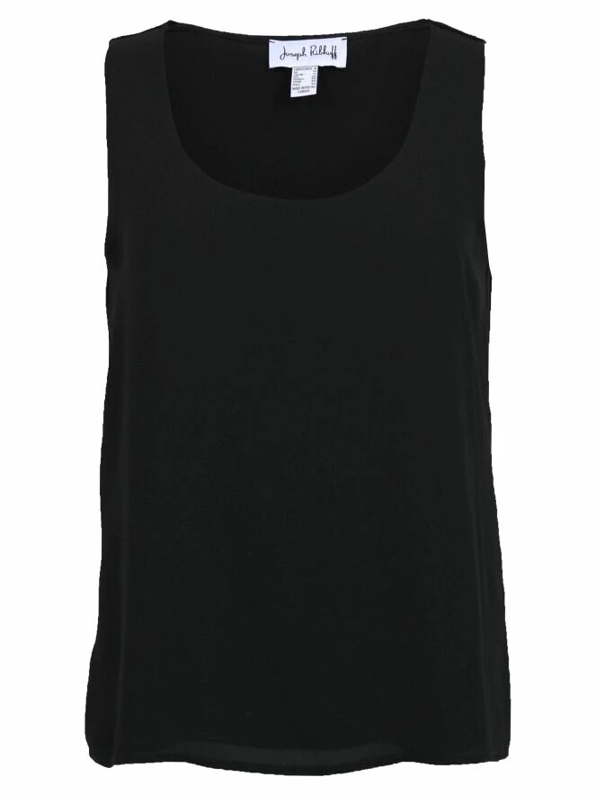 Top sans manches à la coupe droite, de la marque Joseph Ribkoff, de couleur noire. Le top présente un col rond profond et un avant en tissu double. Lavage à la main.
