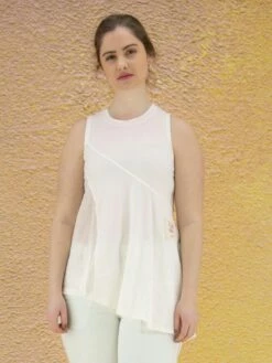 Top sans manches à la coupe droite, de la marque Joseph Ribkoff, de couleur ocre jaune. Le top présente un col rond profond et un avant en tissu double. Lavage à la main.