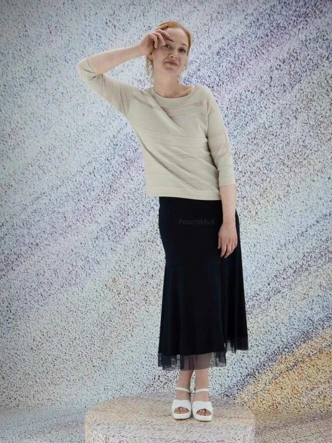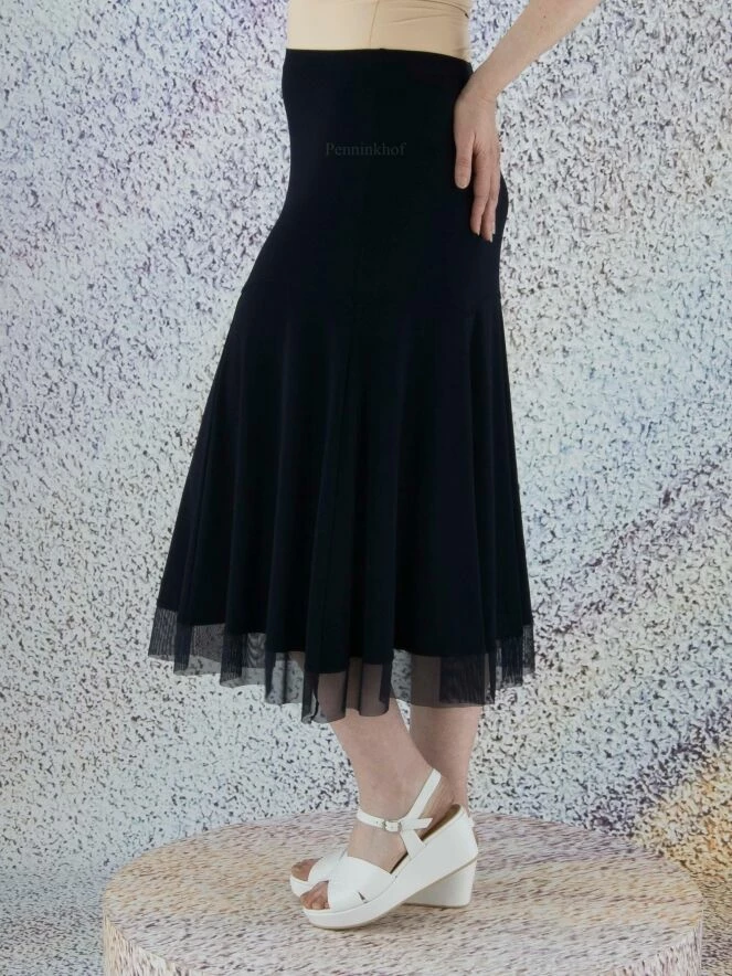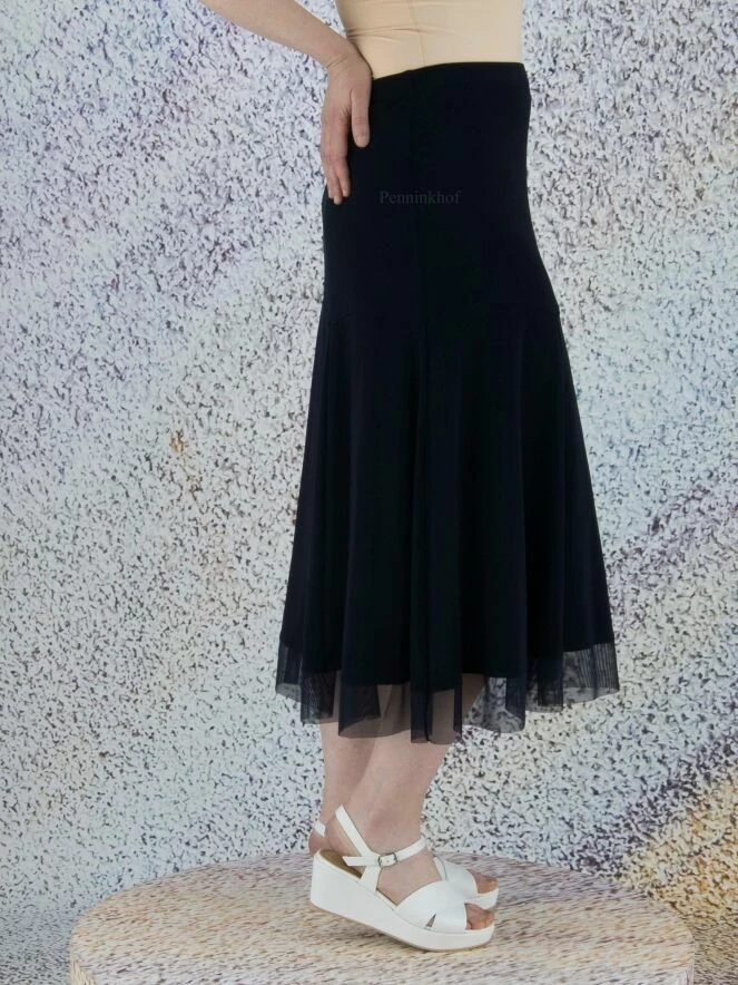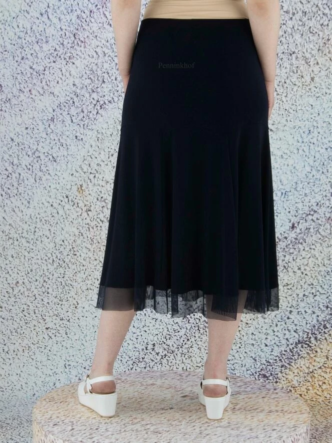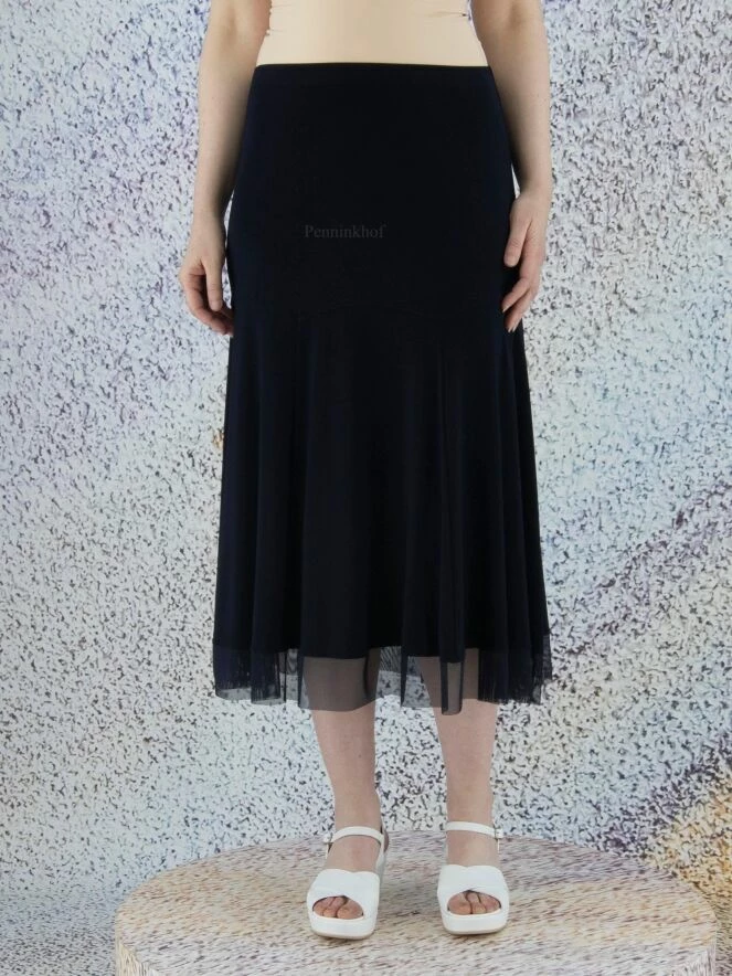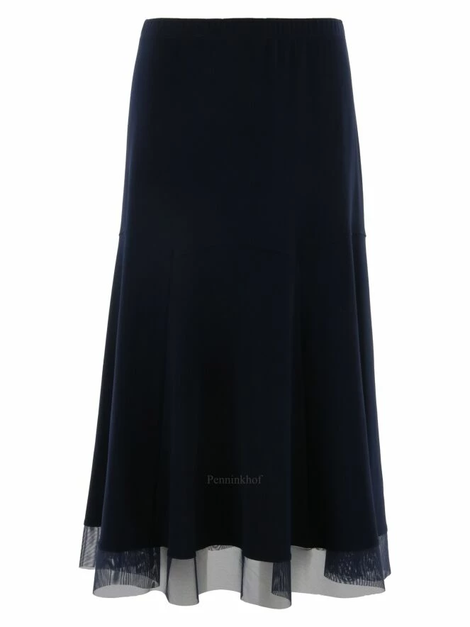 Jupe Ă la coupe en ligne A de la marque Joseph Ribkoff, de couleur bleu marine. La taille est dotĂ©e d’une bande Ă©lastique. Au niveau des hanches, une couture horizontale crĂ©e une ligne fluide ornĂ©e d’une bordure en voile au bas. Lavage Ă la main.