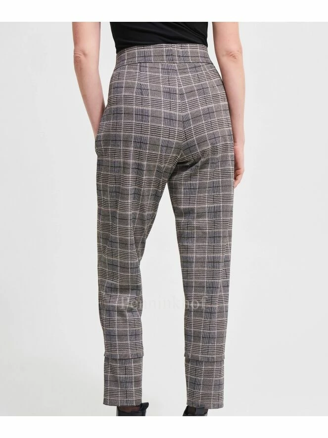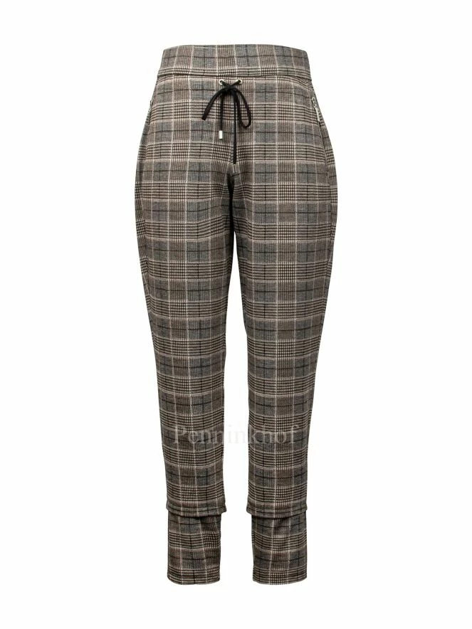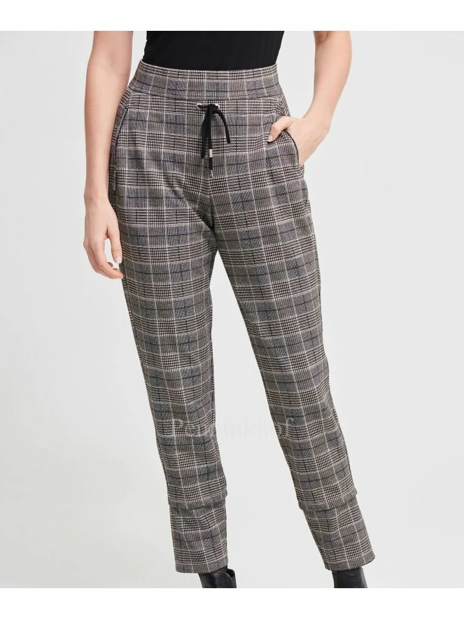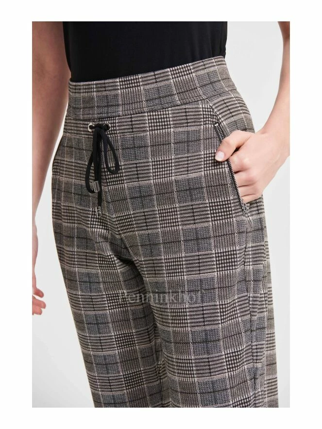 Pantalon de la marque Joseph Ribkoff, à carreaux Prince de Galles aux couleurs crème, beige et noir. La taille est dotée d’une bande élastique. A l’avant, un cordon noir à nouer est inséré sous la ceinture. Le pantalon est équipé de poches à l’avant avec un zip de fermeture de couleur argentée. Lavage à la main.