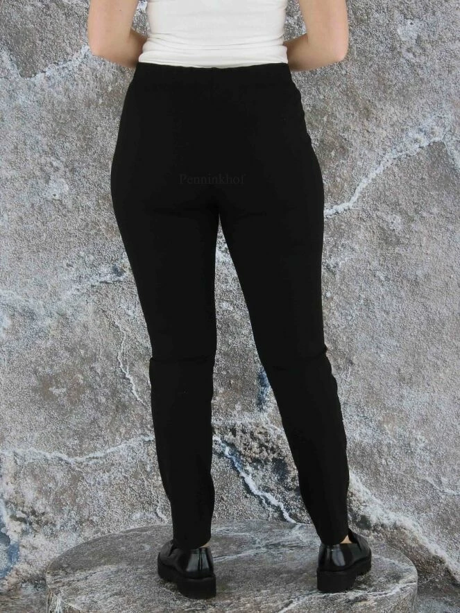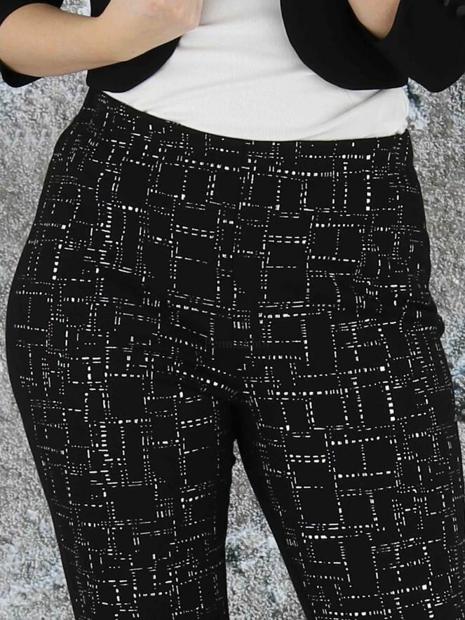 Pantalon de la marque Joseph Ribkoff, Ă motif de lignes pointillĂ©es et croisĂ©es en gris argentĂ© en relief sur un fond noir. L’arrière est de couleur noire unie. La taille est Ă©lastiquĂ©e. Lavage Ă la main.