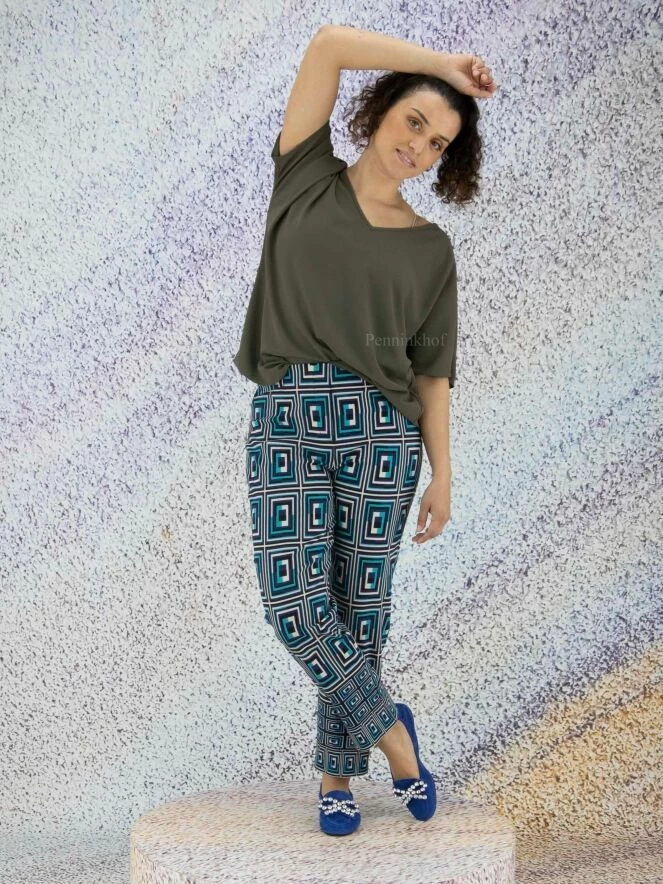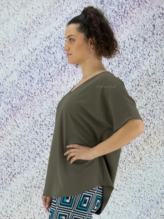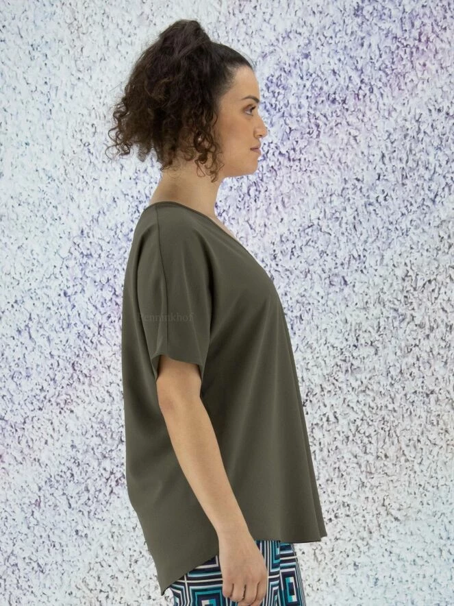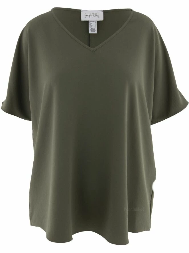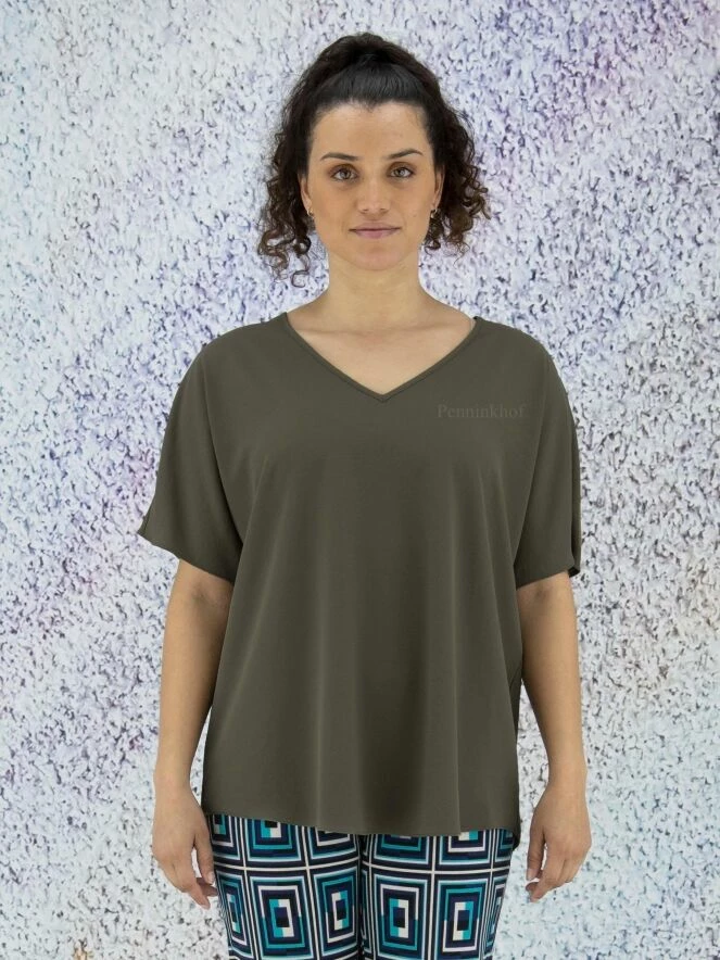 Tee-shirt ample de la marque Joseph Ribkoff, de couleur vert olive. Ce tee-shirt présente un col en V et des manches courtes. Lavage à la main.