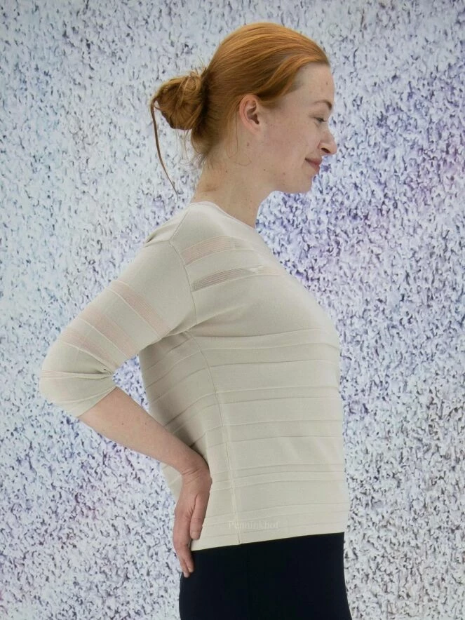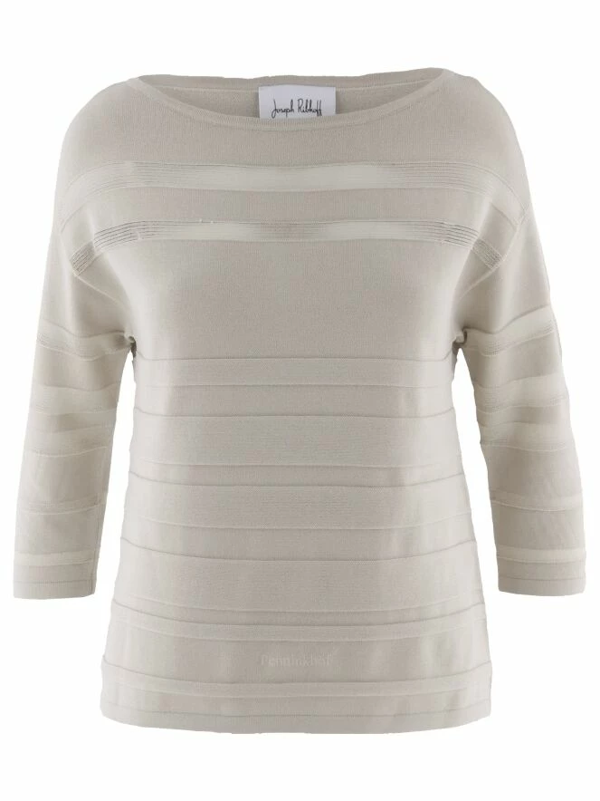 Pull de la marque Joseph Ribkoff dans une structure à rayures horizontales partiellement transparentes de couleur sable. Le pull présente une encolure large et des manches mi-longues. Lavage à la main.