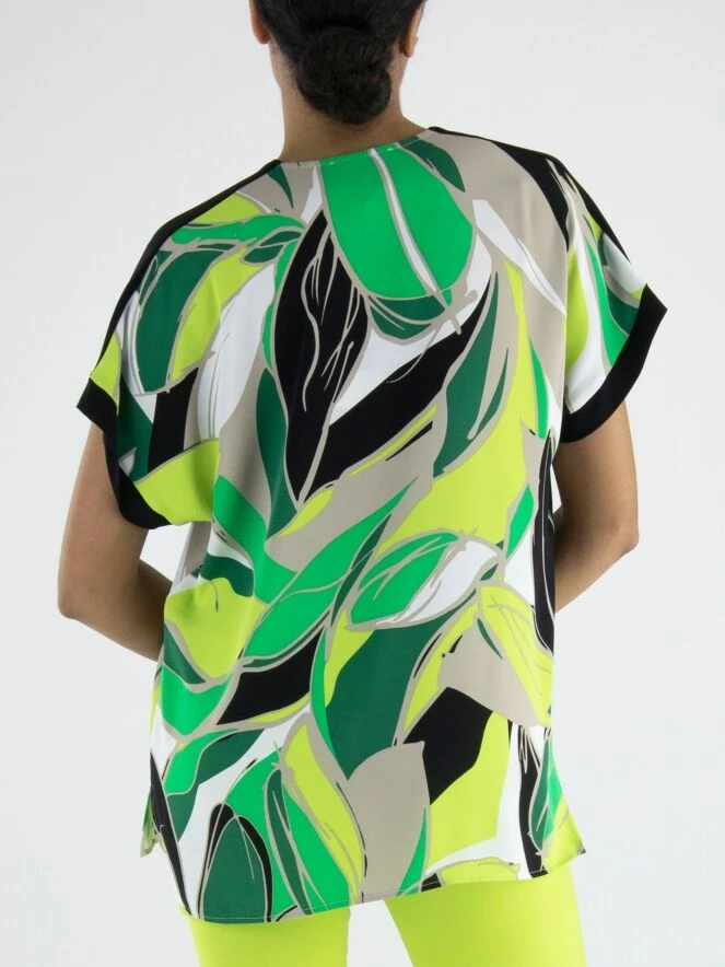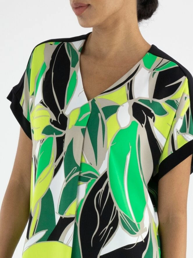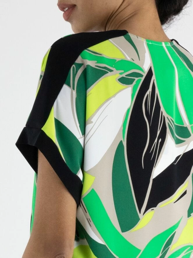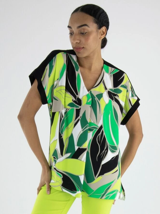 Un chemisier de Joseph Ribkoff avec un imprimé de feuilles en plusieurs nuances de vert, noir, sable et blanc. Le long du bord des manches courtes et sur le haut des épaules, il y a une bordure noire. Ce chemisier peut être lavé à la main.