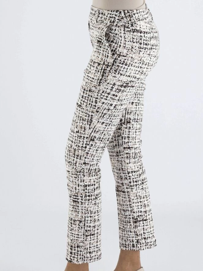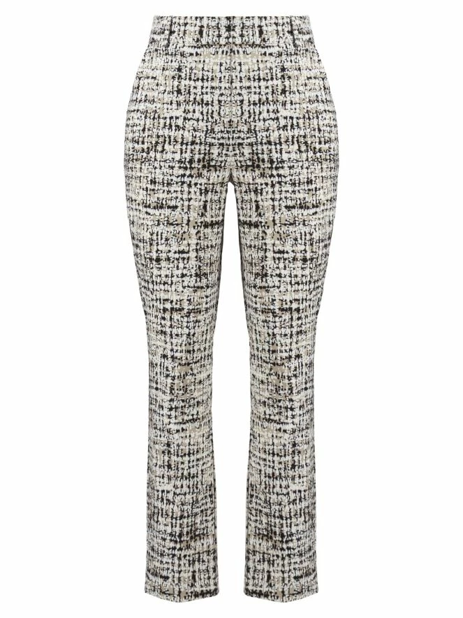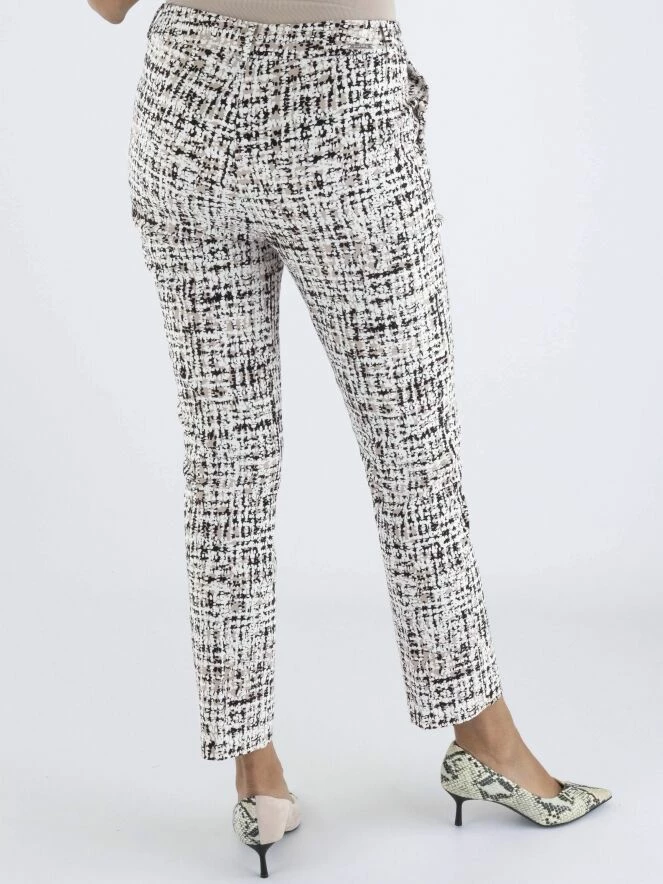 Un pantalon de Joseph Ribkoff avec un imprimĂ© graphique en couleurs blanc, noir et sable. La taille est Ă©quipĂ©e d’une bande Ă©lastique. Un pli bien marquĂ© est prĂ©sent au milieu des jambes. Ce pantalon peut ĂŞtre lavĂ© Ă la main.