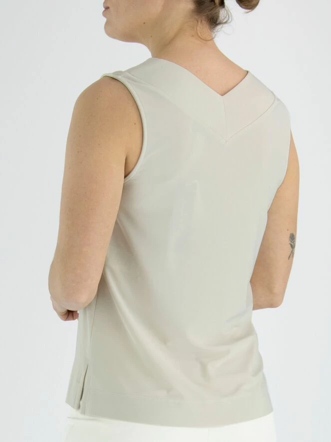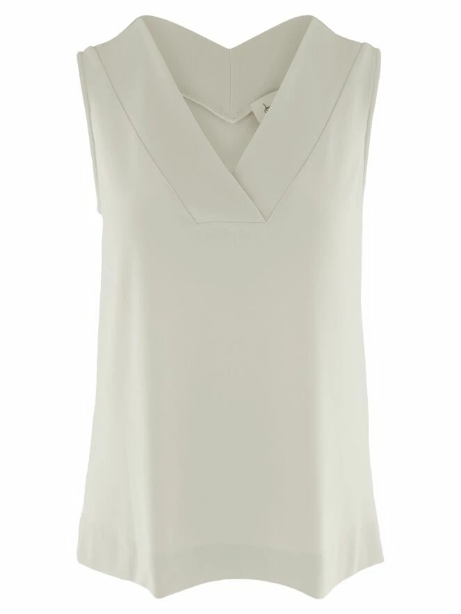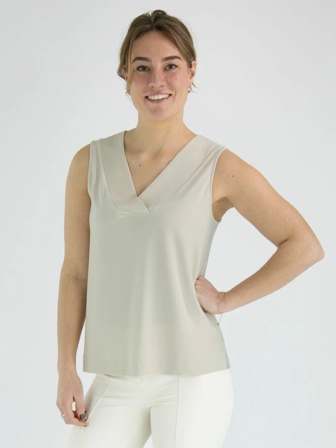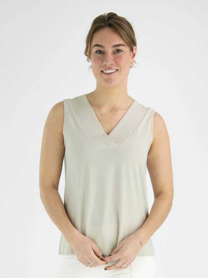 Un haut de Joseph Ribkoff en couleur sable. Le col en V présente un court croisement au milieu. Ce haut peut être lavé à la main.
