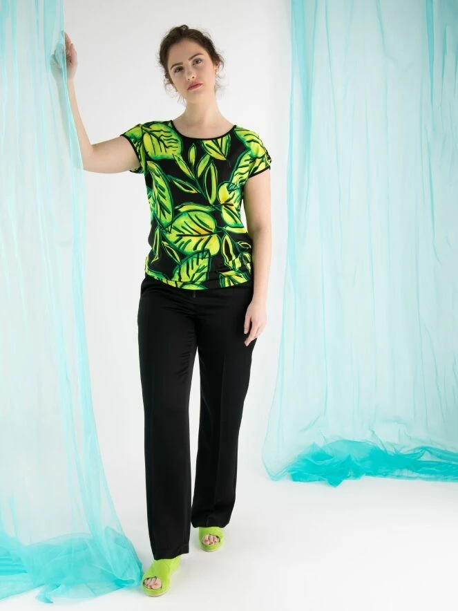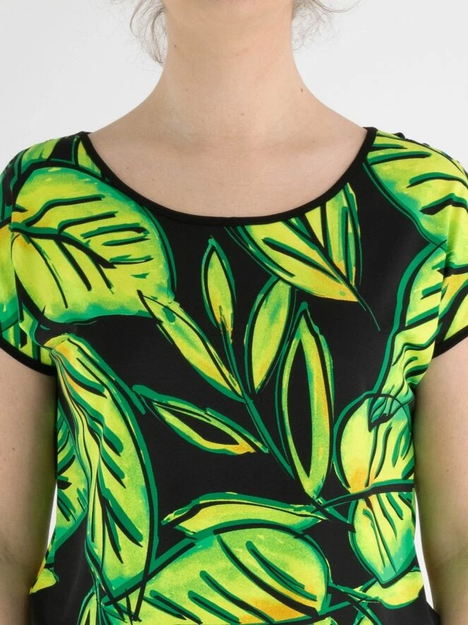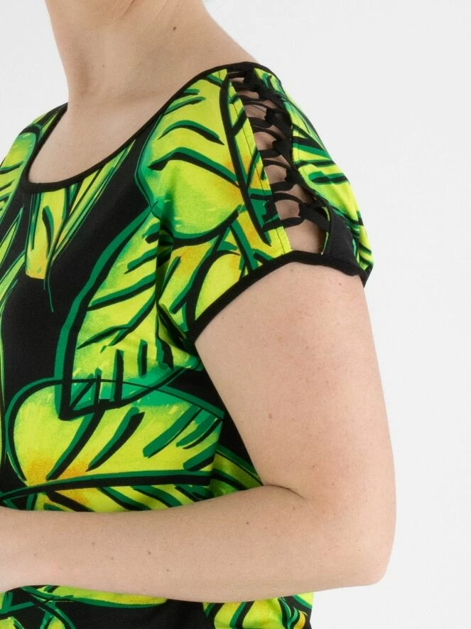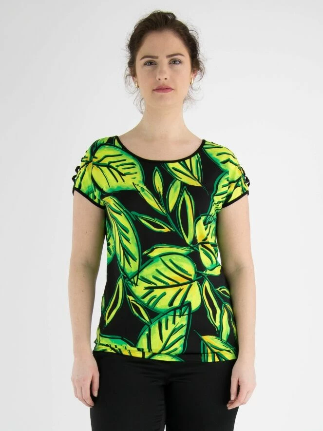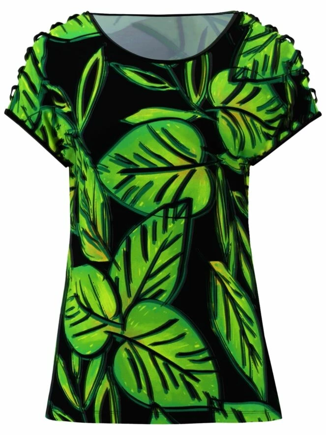 A shirt from Joseph Ribkoff in a print of leaves in multiple shades of green on a black background. On the left shoulder, the top seam is open and tied with a lace decoratively. This shirt may be hand washed.