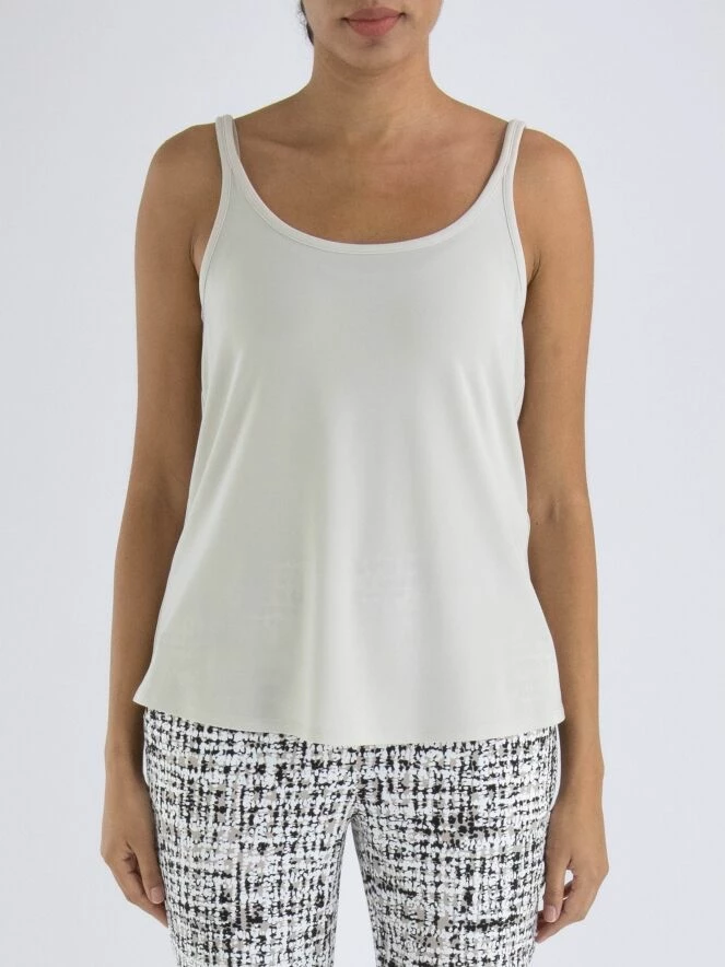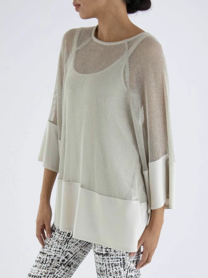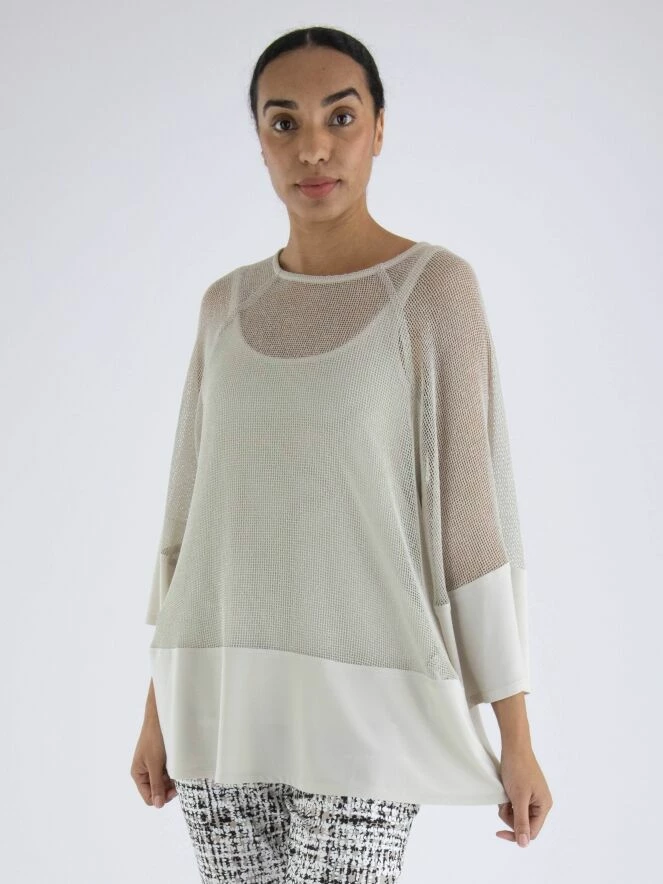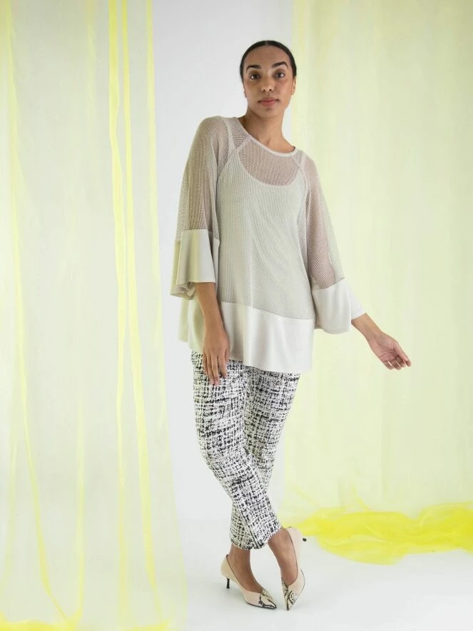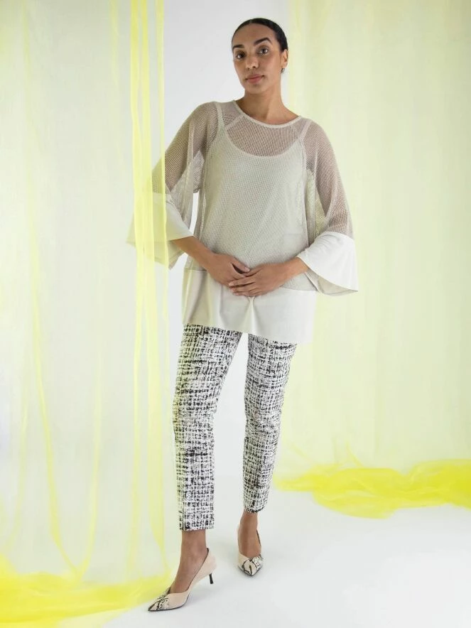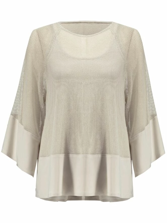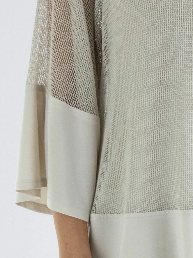 Un chemisier ouvert tissé de Joseph Ribkoff dans une structure de filet en couleur beige. Sous le chemisier se trouve un top uni. En bas du chemisier, il y a une large bande du même matériel que le top. Le chemisier a un col rond et des manches mi-longues. Ce chemisier avec top peut être lavé à la main.