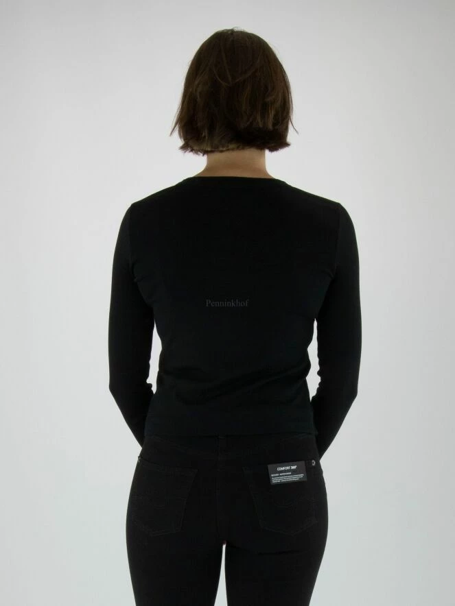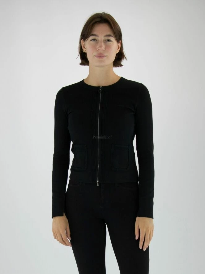 Un cardigan de la marque Marc Cain de couleur noire. Le cardigan a des manches longues et une encolure ronde. Une bande côtelée longe l’encolure et la fermeture à glissière. Une petite fente se trouve à l’extrémité des manches. Ce cardigan peut être lavé à 30 degrés.