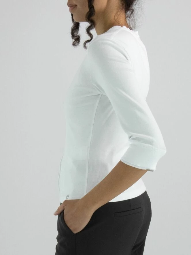 Un gilet de la marque Marc Cain en blanc. Le gilet a des manches mi-longues et un col rond. Le long du col et de la fermeture éclair se trouve une bande côtelée. Ce gilet peut être lavé à 30 degrés.