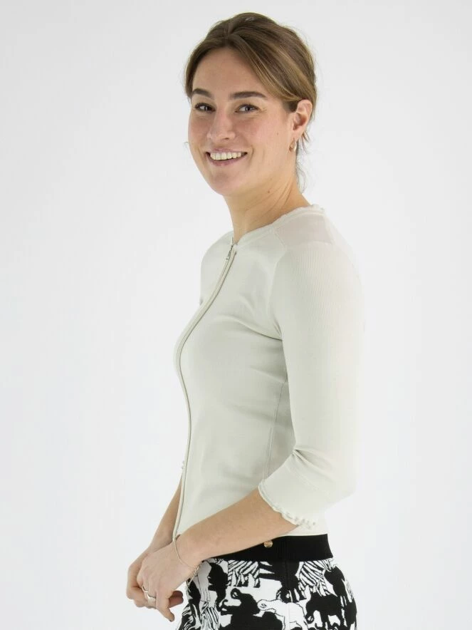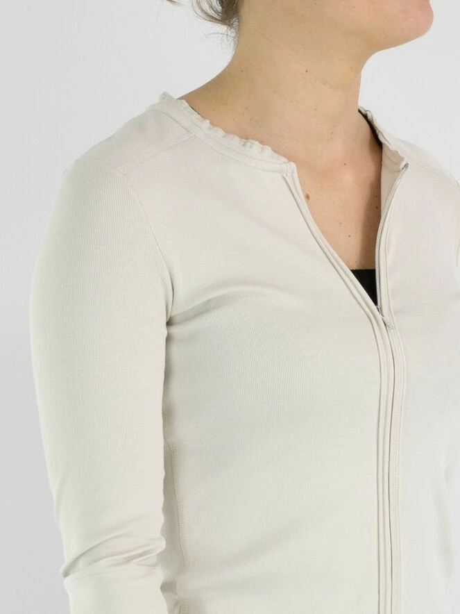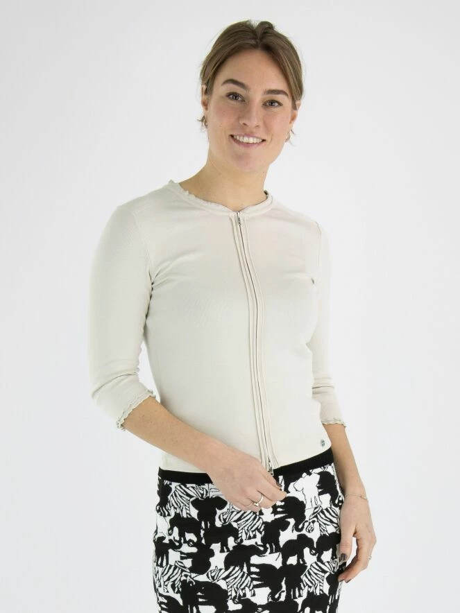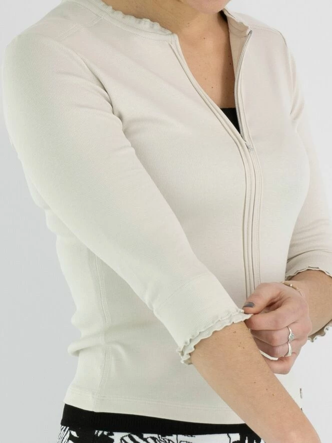 Un gilet de la marque Marc Cain en couleur sable. Le gilet a des manches mi-longues et un col rond. Le long du col et de la fermeture éclair se trouve une bande côtelée. Ce gilet peut être lavé à 30 degrés.