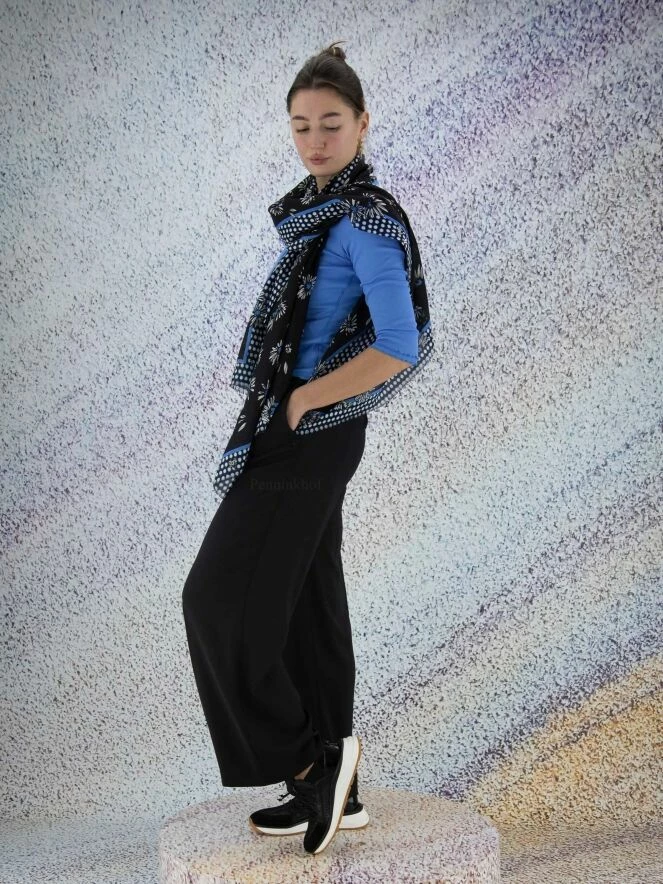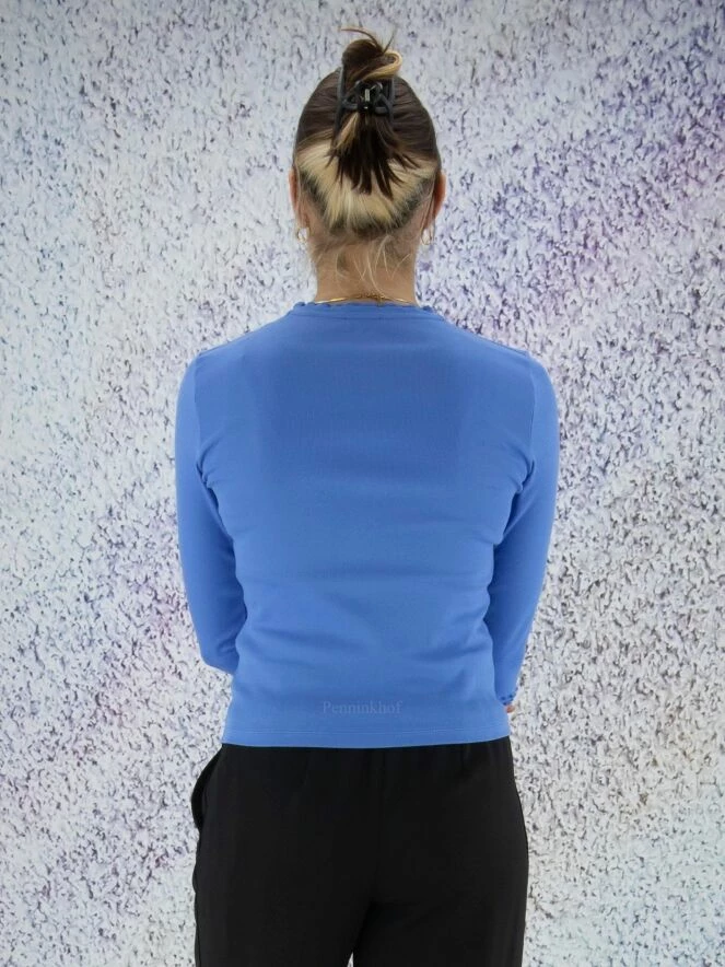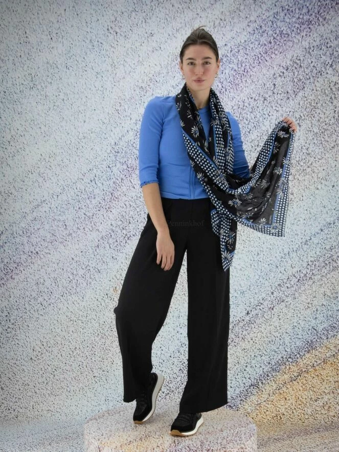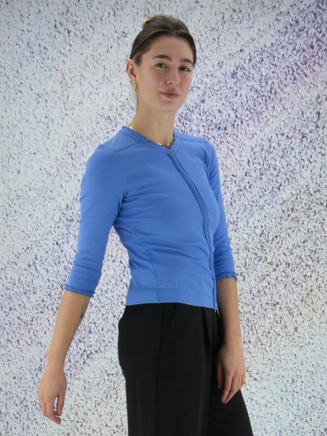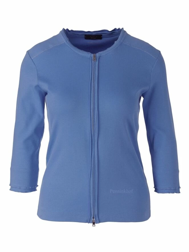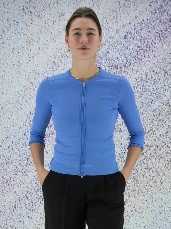 Cardigan de la marque Marc Cain, de couleur bleue. Le cardigan présente des manches trois-quart qui se finissent pas un double tissu légèrement ondulé. L’encolure ronde s’ouvre sur une fermeture Eclair à double curseur bordée d’une bande en relief lègèrement ondulé. Lavage à 30 degrés.