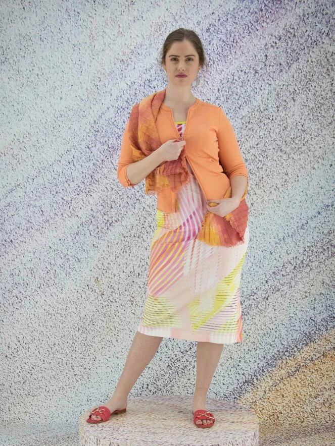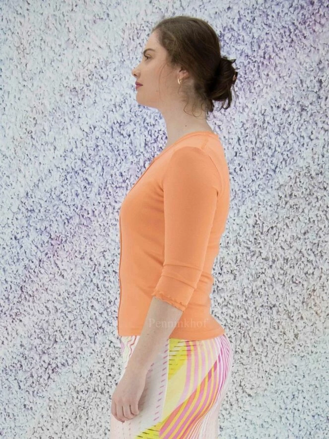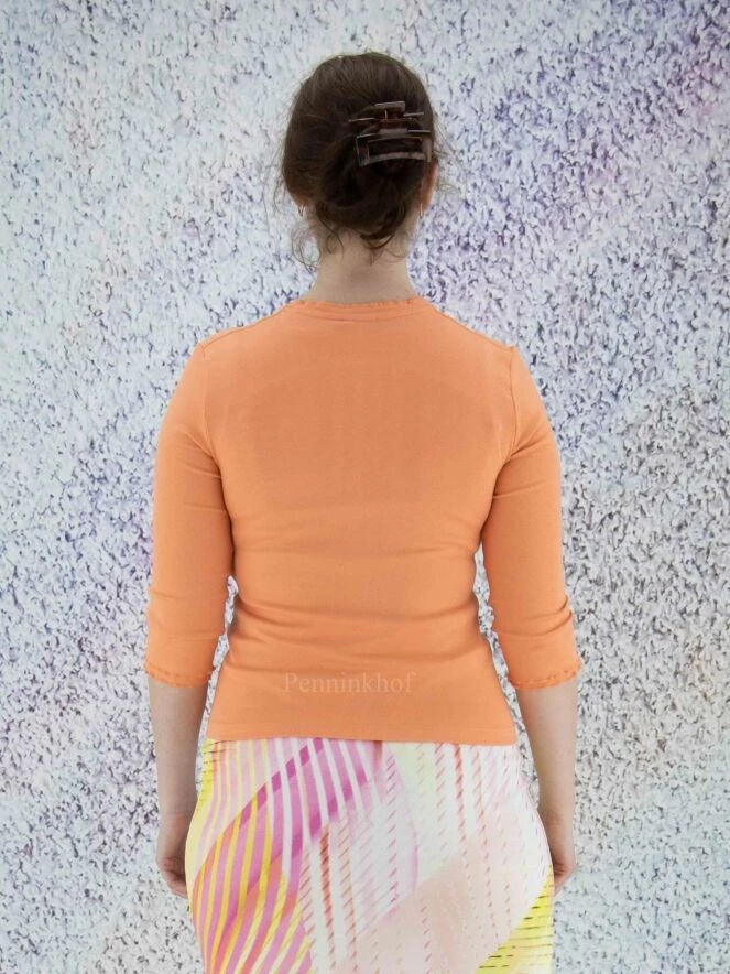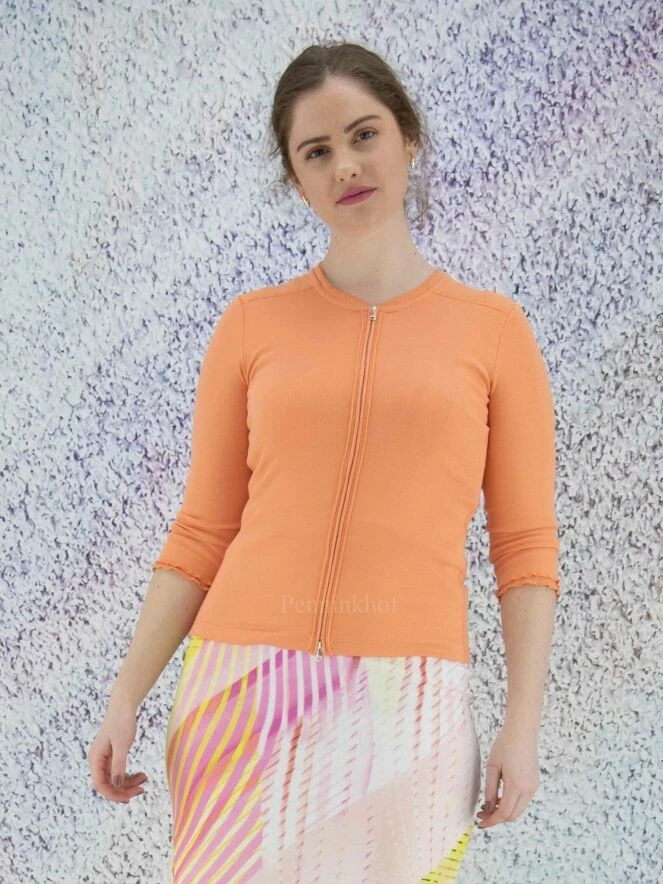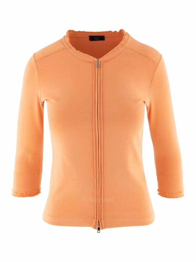 Cardigan de la marque Marc Cain, de couleur orange. Le cardigan présente des manches trois-quart qui se finissent pas un double tissu légèrement ondulé. L’encolure ronde s’ouvre sur une fermeture Eclair à double curseur bordée d’une bande en relief lègèrement ondulé. Lavage à 30 degrés.