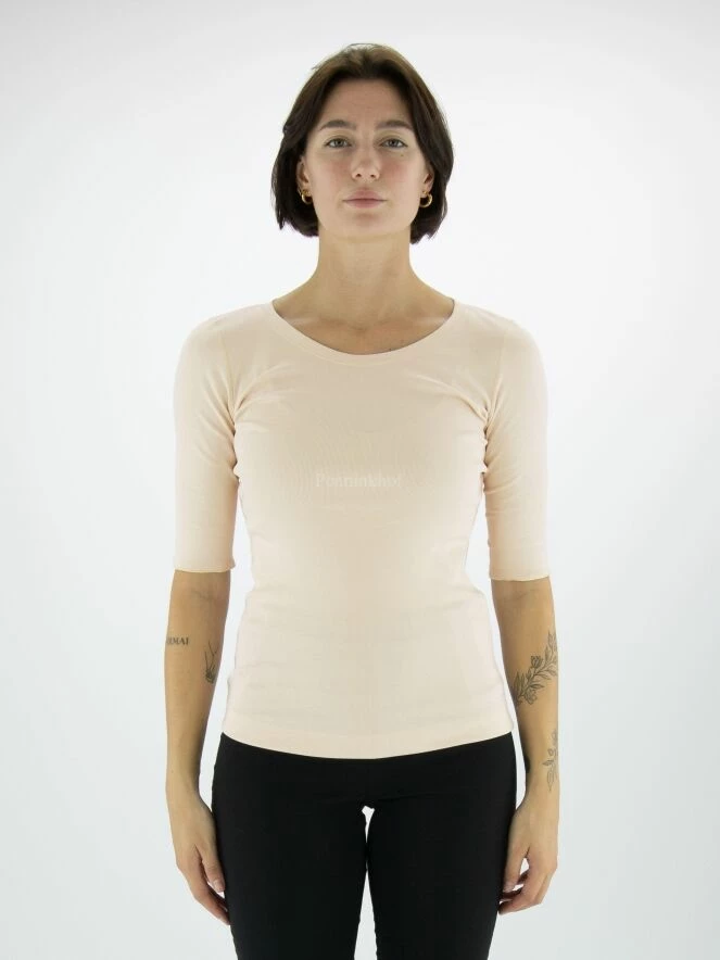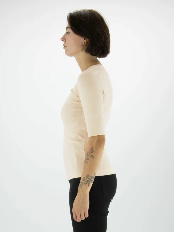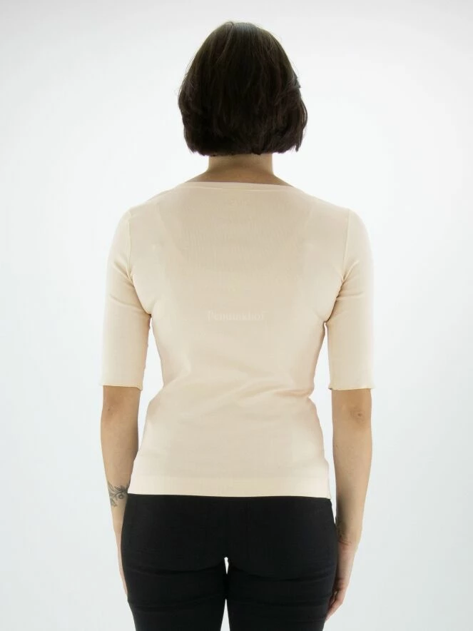 Un T – shirt de Marc Cain dans la couleur nude. Les manches courtes sont retroussées. Le T – shirt a un col rond et peut être lavée à 30 degrés.