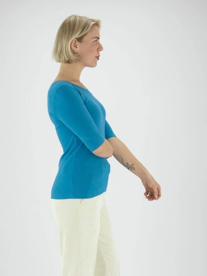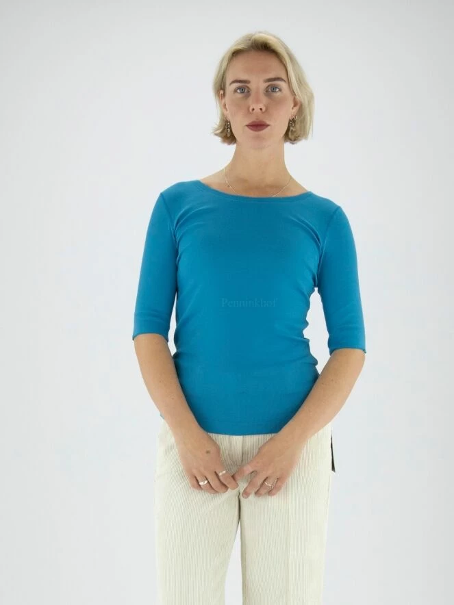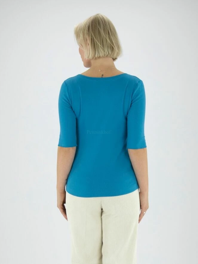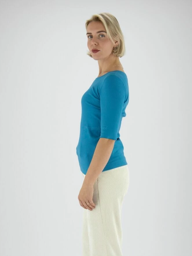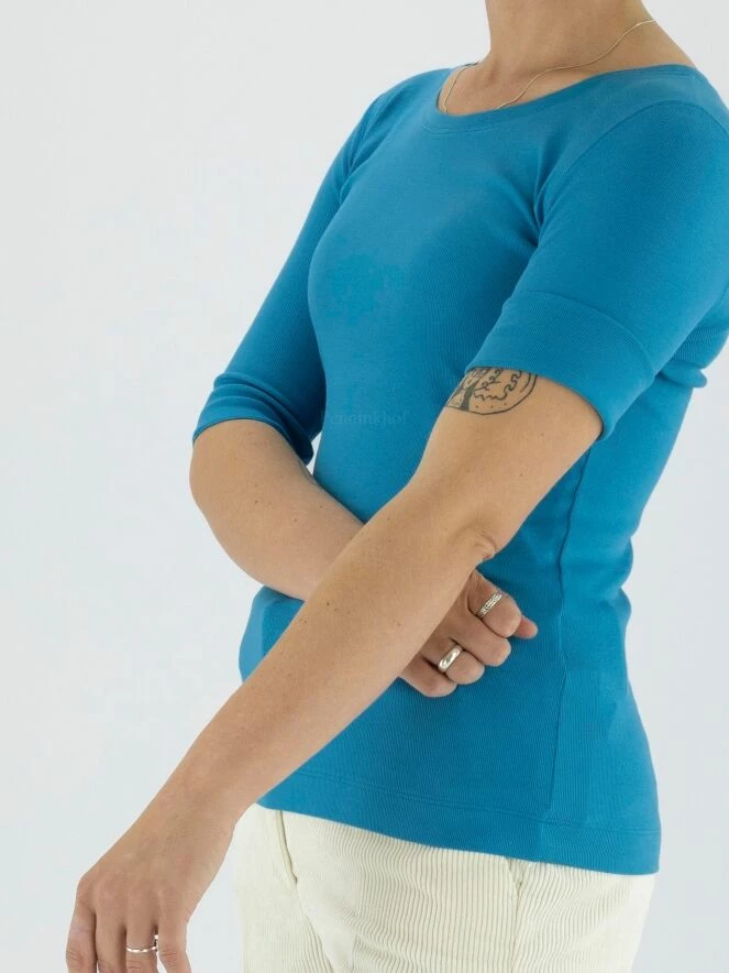 Une T – shirt de Marc Cain dans le coloris bleu. Les manches courtes sont retroussées. La T – shirt a un col rond et peut être lavée à 30 degrés.