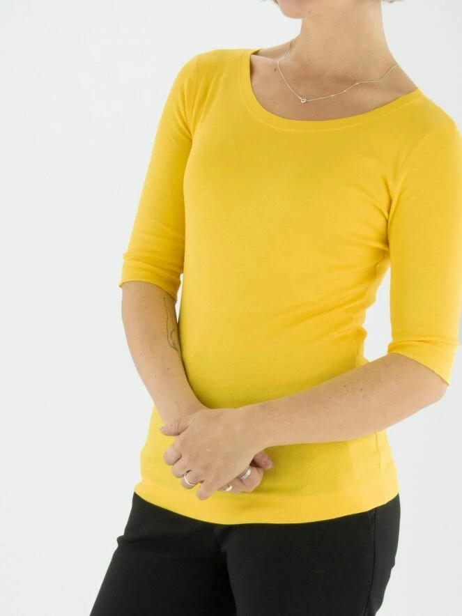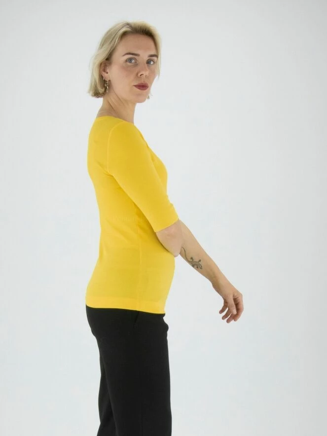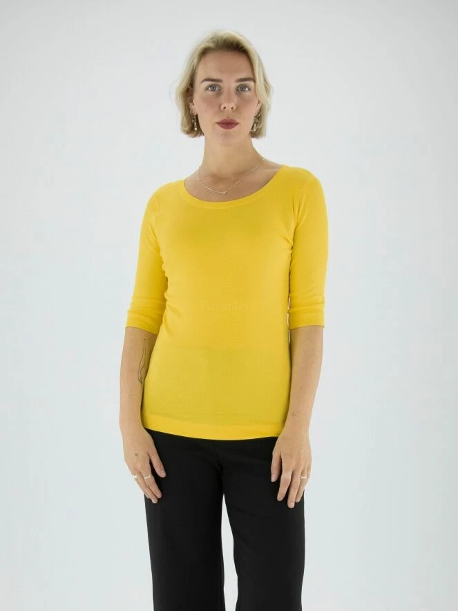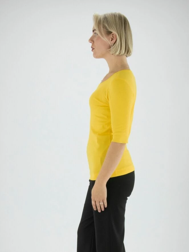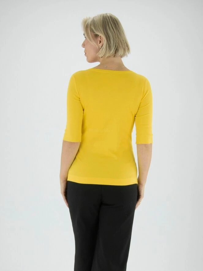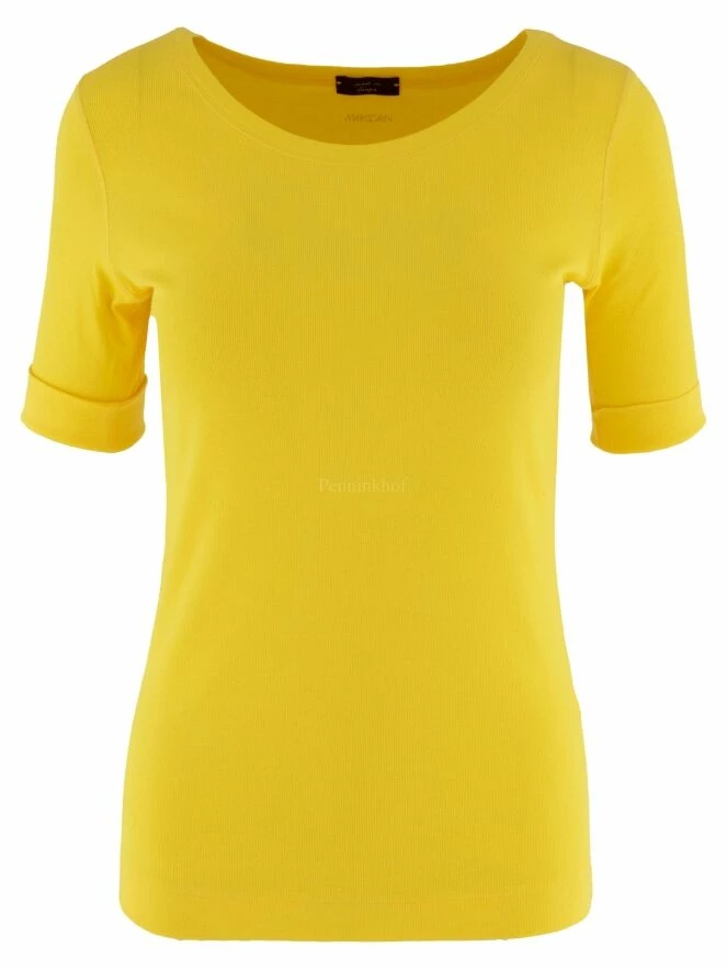 T shirt de Marc Cain de couleur jaune. Les manches courtes sont retroussées. La T – shirt a un col rond et peut être lavée à 30 degrés.