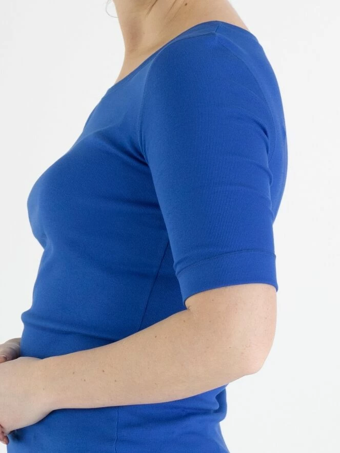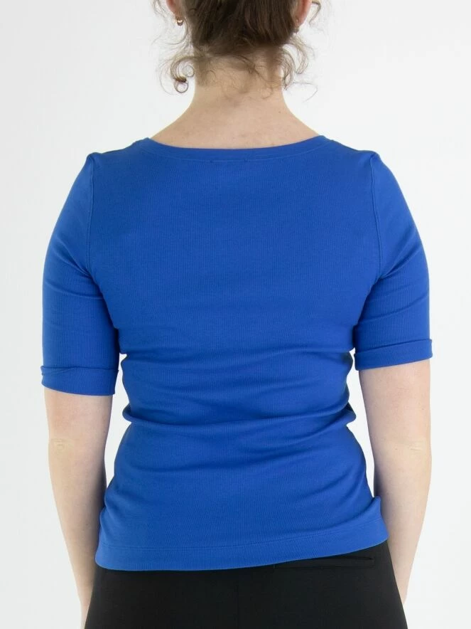 Un chemisier de Marc Cain en bleu cobalt. Les manches courtes ont un revers. Le chemisier a un col rond et peut être lavé à 30 degrés.