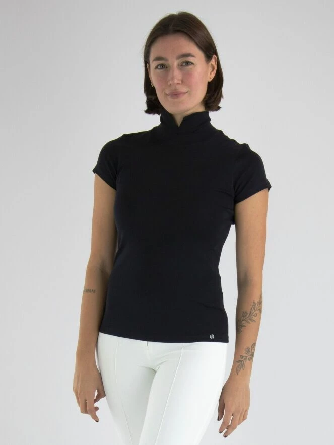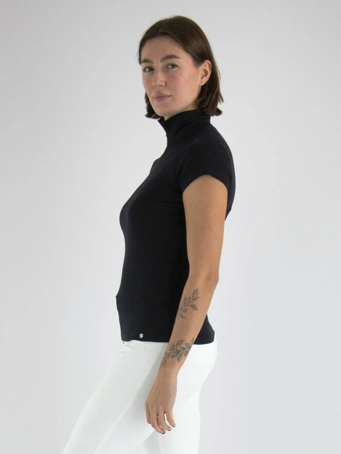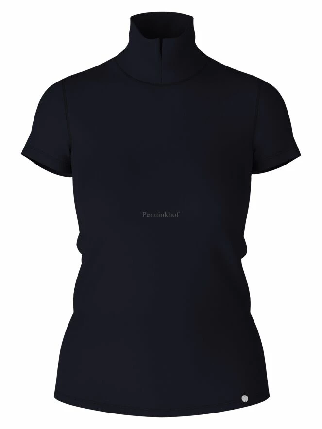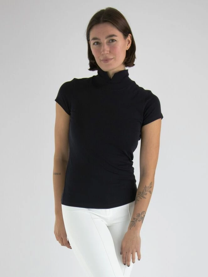 Tee-shirt à manches courtes de la marque Marc Cain, de couleur bleu marine. Le tee-shirt présente un col montant refendu sur l’avant. Des passepoils ornent le bas du col et des emmanchures. Lavage à 30 degrés.