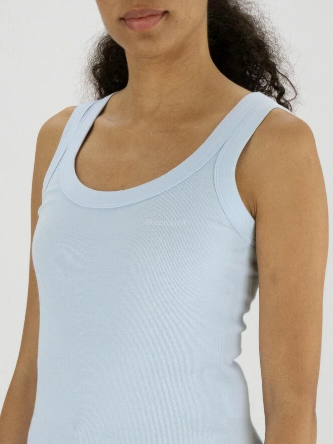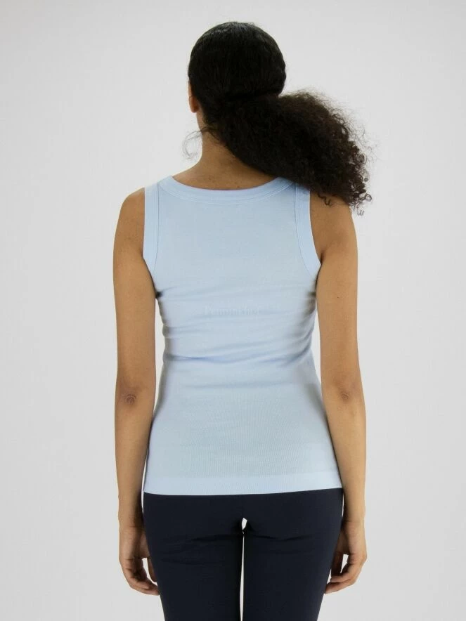 DĂ©bardeur Ă col rond de la marque Marc Cain, de couleur bleu pastel. Le col et les emmanchures sont bordĂ©s d’un large passepoil. Lavage Ă 30 degrĂ©s.