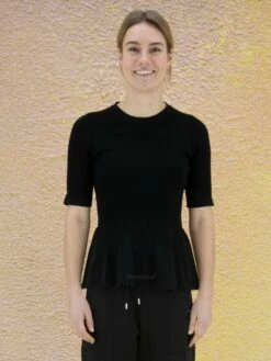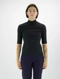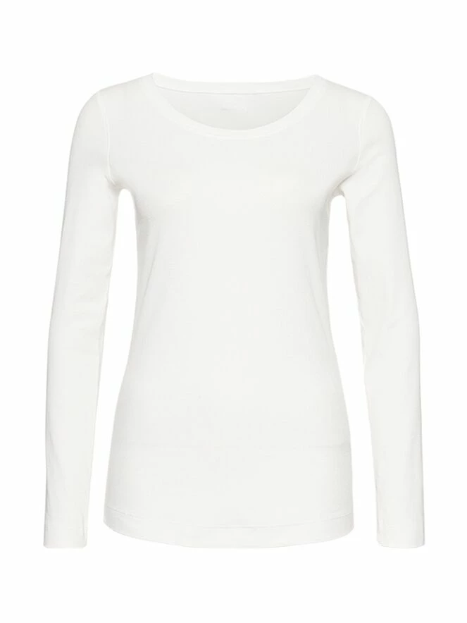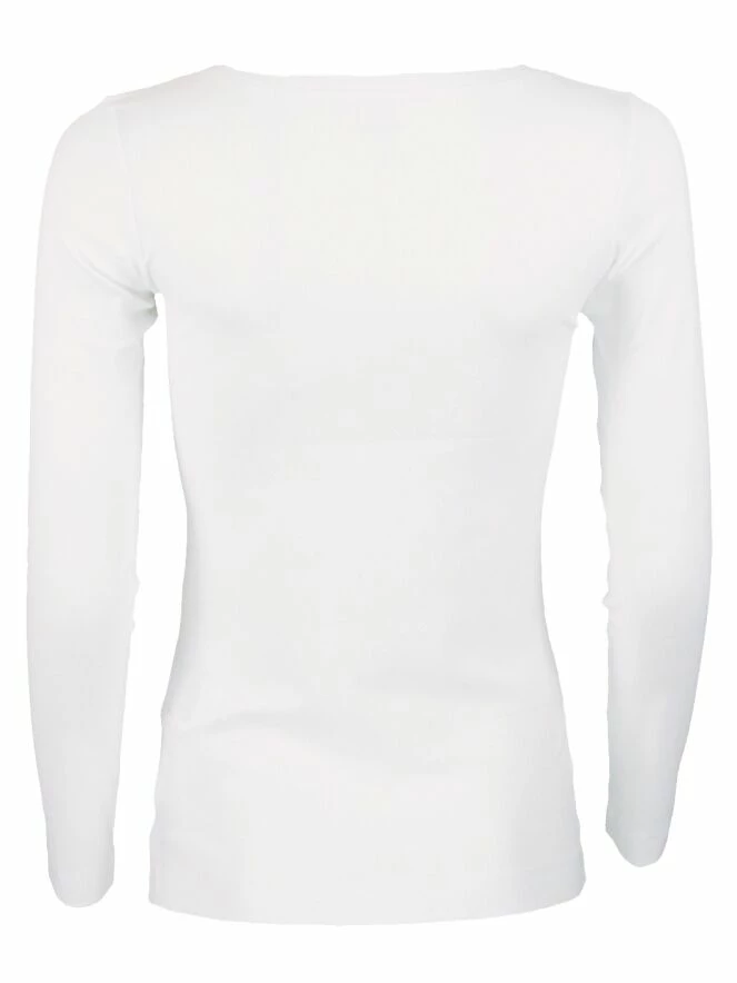 Tee-shirt basique de la marque Marc Cain, de couleur blanc. Il est fait d’une maille finement côtelée. Le tee-shirt présente des manches longues et une encolure ronde. Lavage à 30 degrés.