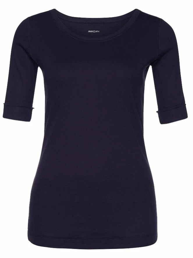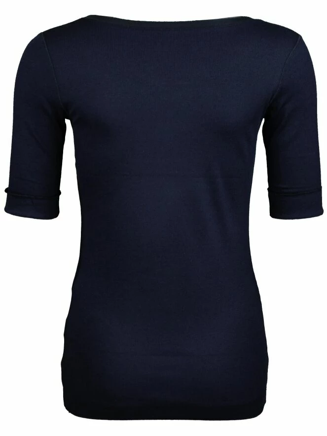 Tee-shirt finement côtelé, de la marque Marc Cain Essentiels, de couleur bleu marine. Le tee-shirt présente un col rond et des manches courtes à large passepoil. Lavage à 30 degrés.