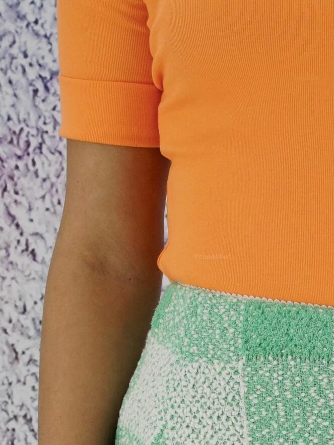 Tee-shirt de la marque Marc Cain, en coton très finement côtelé de couleur orange. Le tee-shirt présente une encolure ronde et des manches courtes à bords très légèrement roulottés. Lavage à 30 degrés.