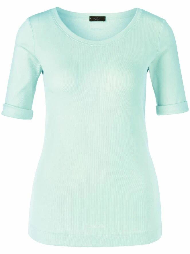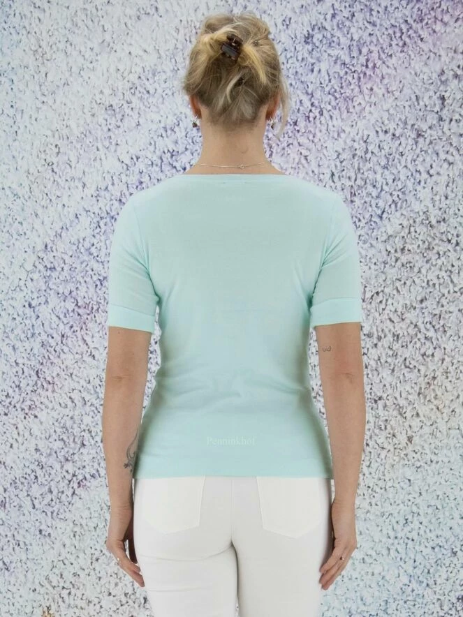Tee-shirt de la marque Marc Cain, en coton très finement côtelé de couleur vert menthe. Encolure ronde et manches courtes à bords très légèrement roulottés. Lavage à 30 degrés.