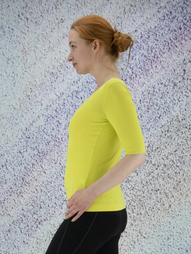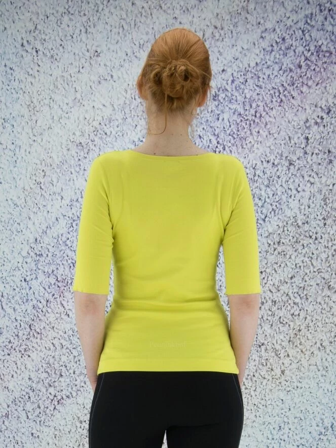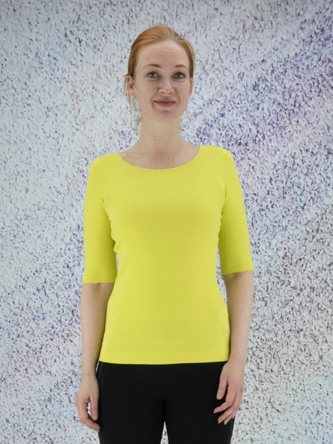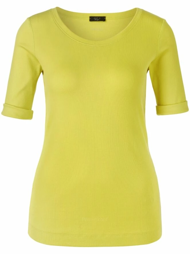 Tee-shirt de la marque Marc Cain, en coton très finement côtelé de couleur jaune citron. Encolure ronde et manches courtes à bords très légèrement roulottés. Lavage à 30 degrés.
