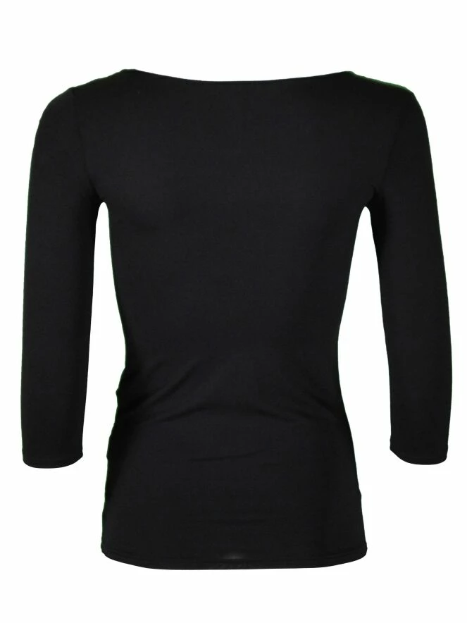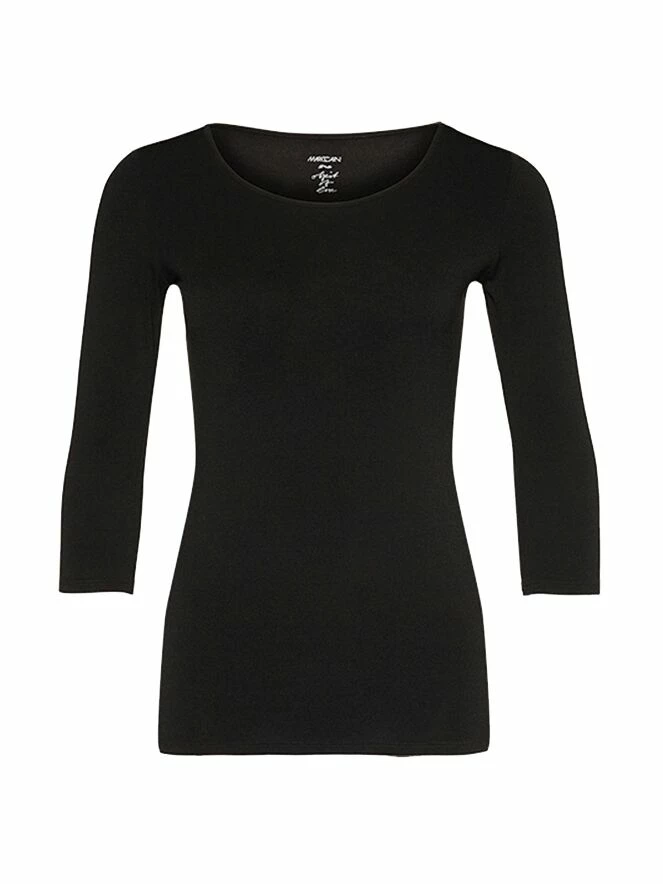 Tee-shirt à manches longues, de la marque Marc Cain essentiels, de couleur noire, légèrement ajusté. L’encolure ronde est ornée d’un fin passepoil. Lavage à 30 degrés.