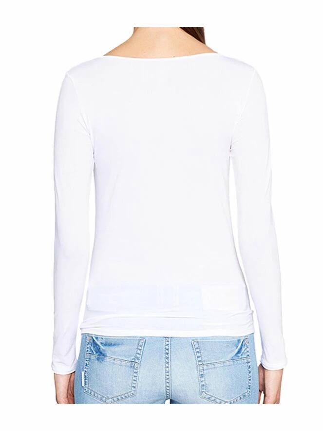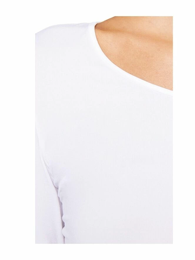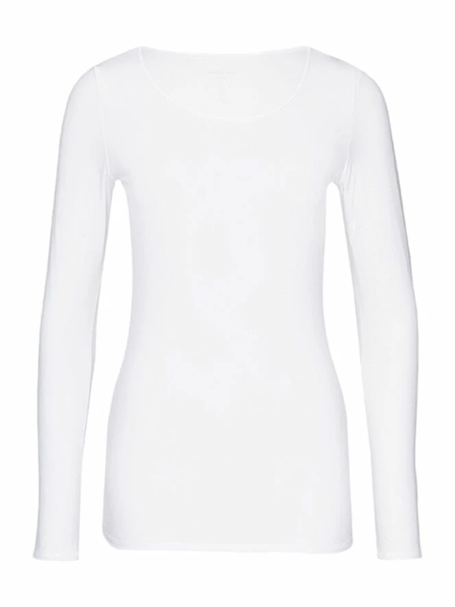 Tee-shirt de qualité supérieure ultra fin, de la marque Marc Cain, de couleur blanche. Modèle de coupe légèrement cintrée, avec un joli col rond et des manches longues. Lavage à 30 degrés.