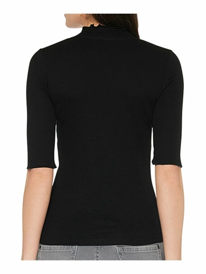 Tee-shirt lĂ©gèrement cintrĂ©, de la marque Marc Cain essentiels, couleur noire. Le tissu est finement nervurĂ©. Ce Tee-shirt est dotĂ© d’un col en V Ă effet superposĂ© avec un empiècement Ă ruchĂ© volantĂ© dĂ©coratif. Les manches courtes sont Ă ourlet roulottĂ©. Lavage Ă 30 degrĂ©s.