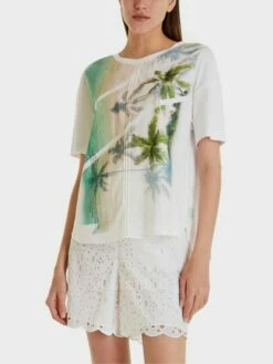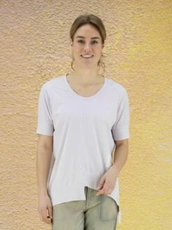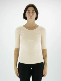 Tee-shirt basique de la marque Marc Cain, de couleur rouge. Il présente des manches mi-longues aux bords légèrement voletant et à col rond. Lavage à 30 degrés.