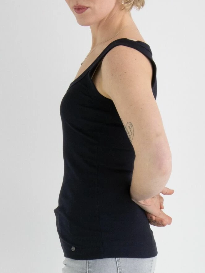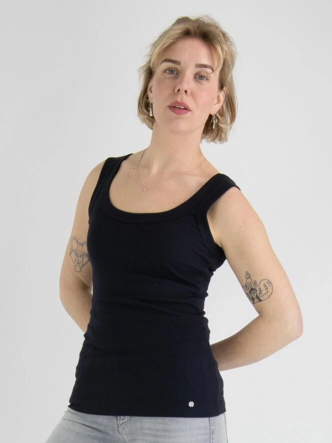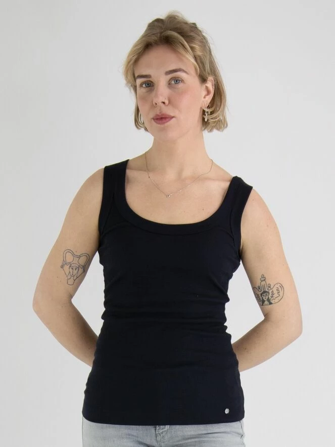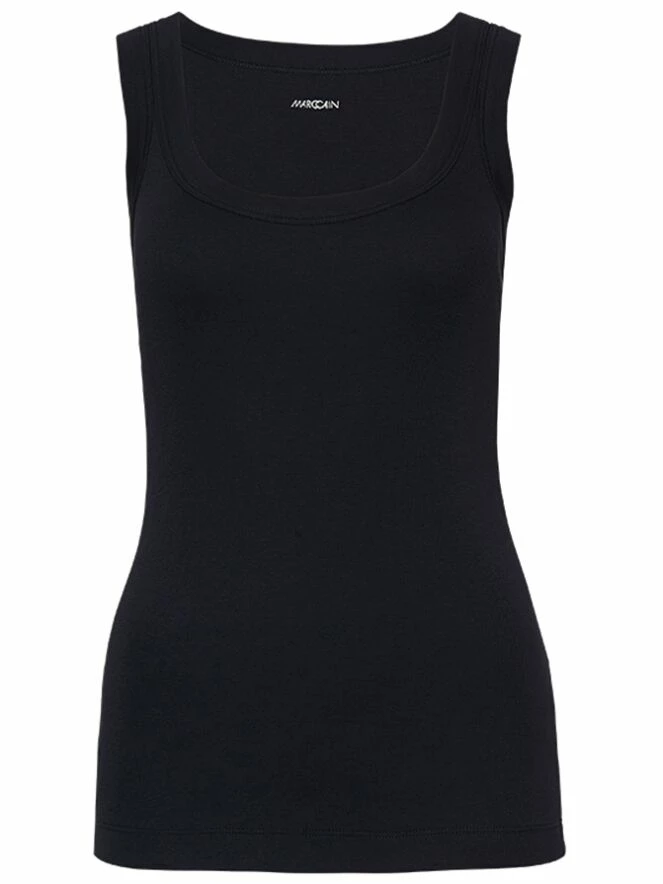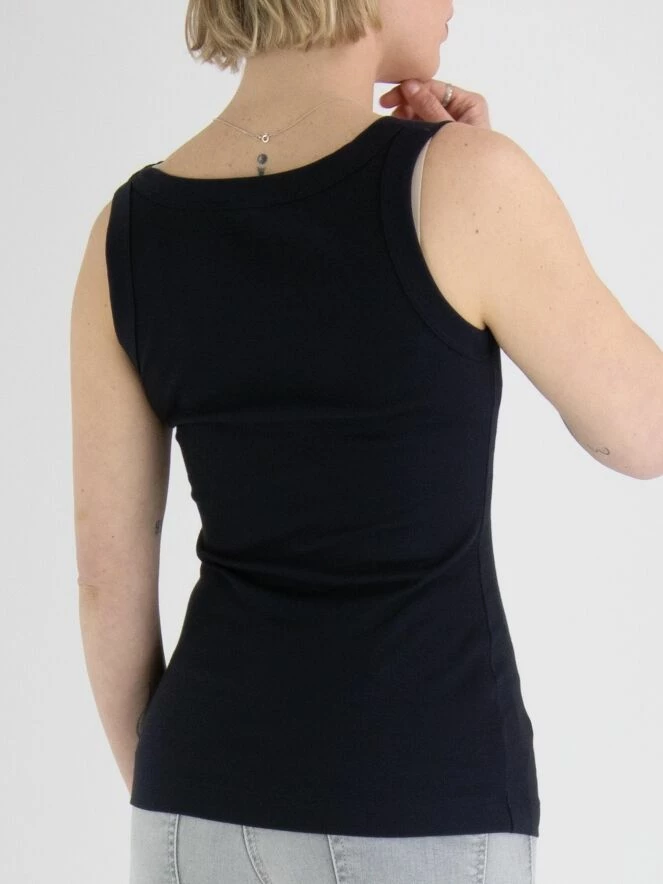 Débardeur à maille fine côtelée de la marque Marc Cain, de couleur bleue. Il présente un col rond. Lavage à 30 degrés.