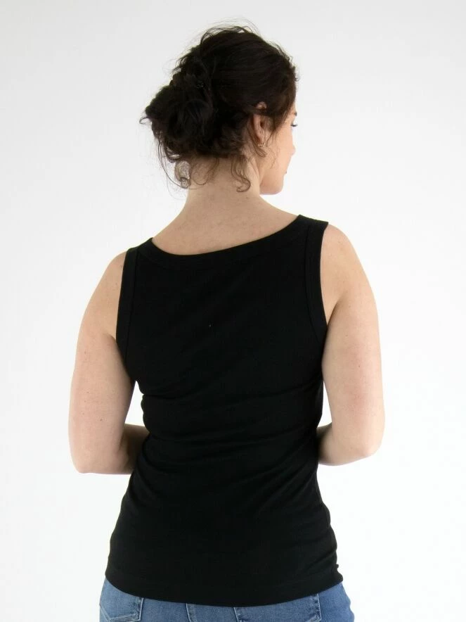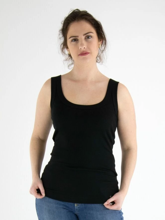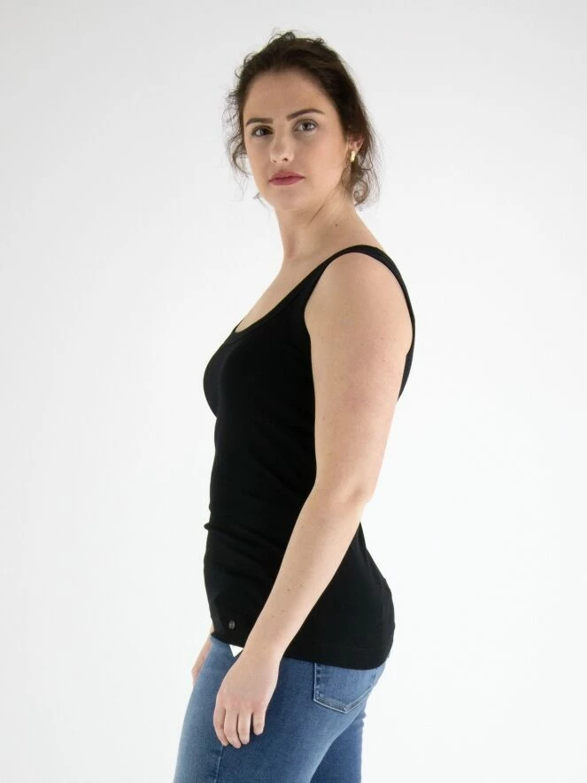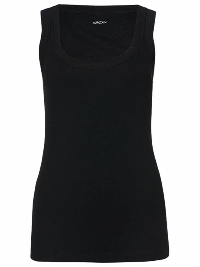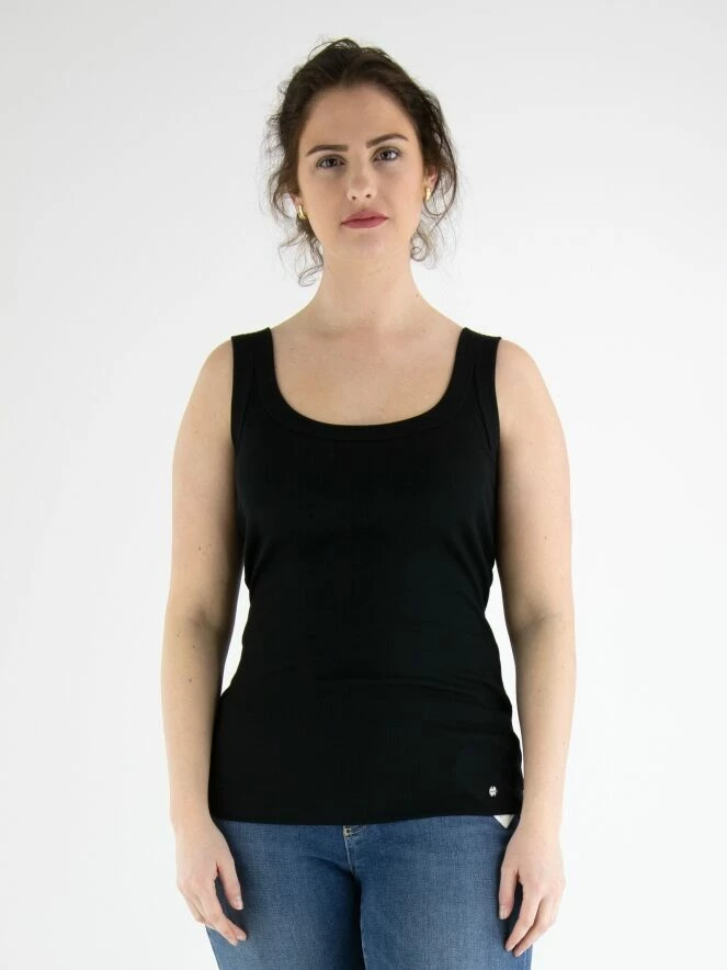 Débardeur à maille fine côtelée de la marque Marc Cain, de couleur noire pastel. Il présente un col rond. Lavage à 30 degrés.